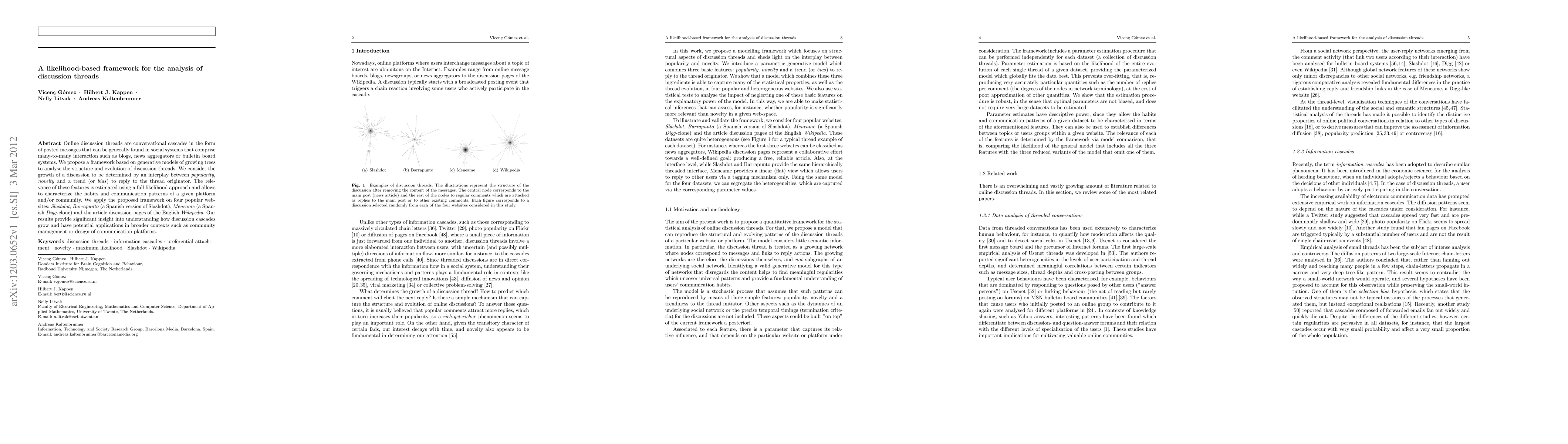 This paper proposes a generative model framework to analyze the structure and evolution of online discussion threads, considering factors like popularity, novelty, and reply bias. The framework uses a full likelihood approach to estimate the relevance of these factors, thereby characterizing communication patterns in various platforms.