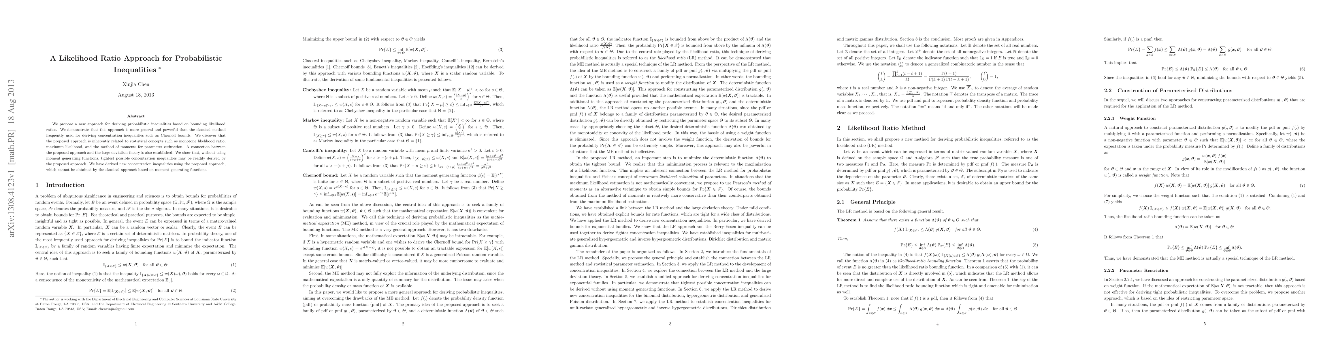 This paper proposes a novel likelihood ratio approach for deriving probabilistic inequalities, demonstrating its superiority over classical methods for concentration inequalities. It connects the new method to statistical concepts and establishes a link to large deviation theory, enabling the derivation of tighter concentration inequalities without moment generating functions.
