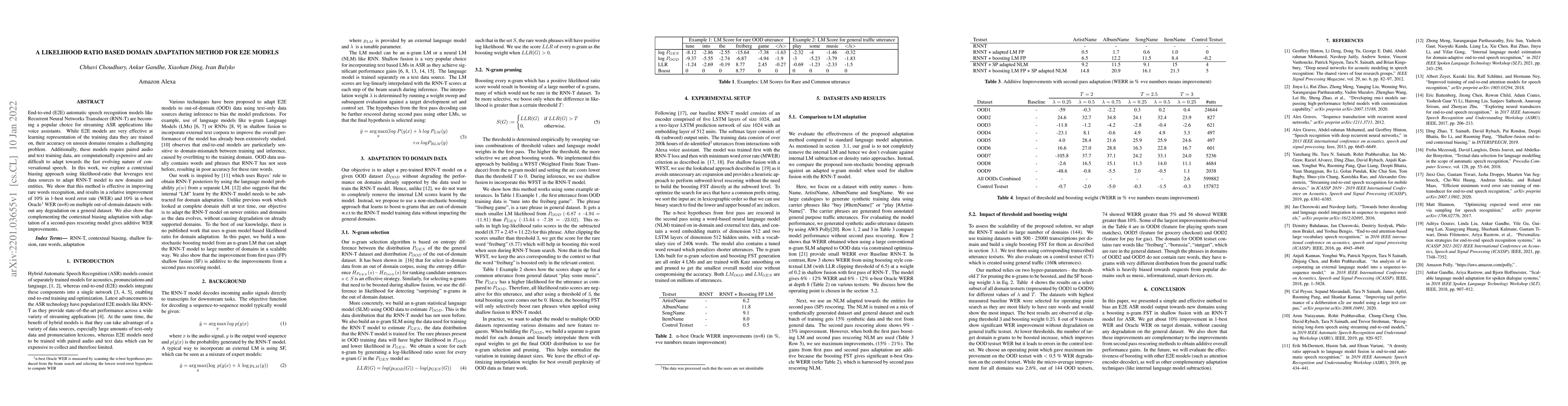 A new method using likelihood-ratio based domain adaptation improves rare word recognition in E2E models by 10% and n-best Oracle WER by 10%, without degrading performance on a general dataset.