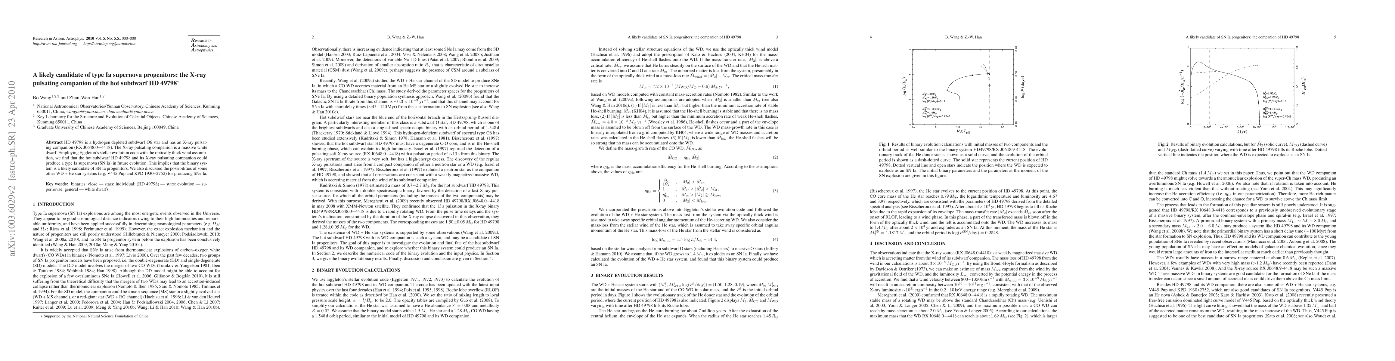 This paper identifies the binary system consisting of the hot subdwarf HD 49798 and its X-ray pulsating companion, a massive white dwarf, as a likely candidate for a type Ia supernova progenitor. Using stellar evolution models, the authors suggest that the system could evolve into a type Ia supernova, highlighting its potential role in the cosmic supernova landscape.