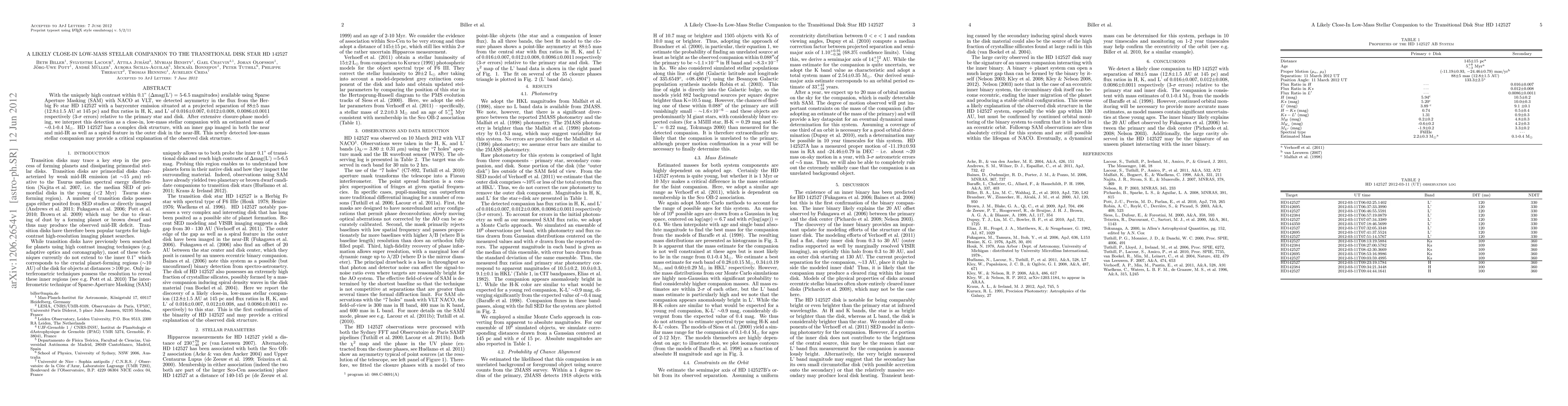 With the uniquely high contrast within 0.1" (\Delta mag(L') = 5-6.5 magnitudes) available using Sparse Aperture Masking (SAM) with NACO at VLT, we detected asymmetry in the flux from the Herbig Fe star HD 142527 with a barycenter emission situated at a projected separation of 88+/-5 mas (12.8+/-1.5 AU at 145 pc) and flux ratios in H, K, and L' of 0.016+/-0.007, 0.012+/-0.008, 0.0086+/-0.0011 respectively (3-\sigma errors) relative to the primary star and disk. After extensive closure-phase modeling, we interpret this detection as a close-in, low-mass stellar companion with an estimated mass of ~0.1-0.4 M_Sun. HD 142527 has a complex disk structure, with an inner gap imaged in both the near and mid-IR as well as a spiral feature in the outer disk in the near-IR. This newly detected low-mass stellar companion may provide a critical explanation of the observed disk structure.