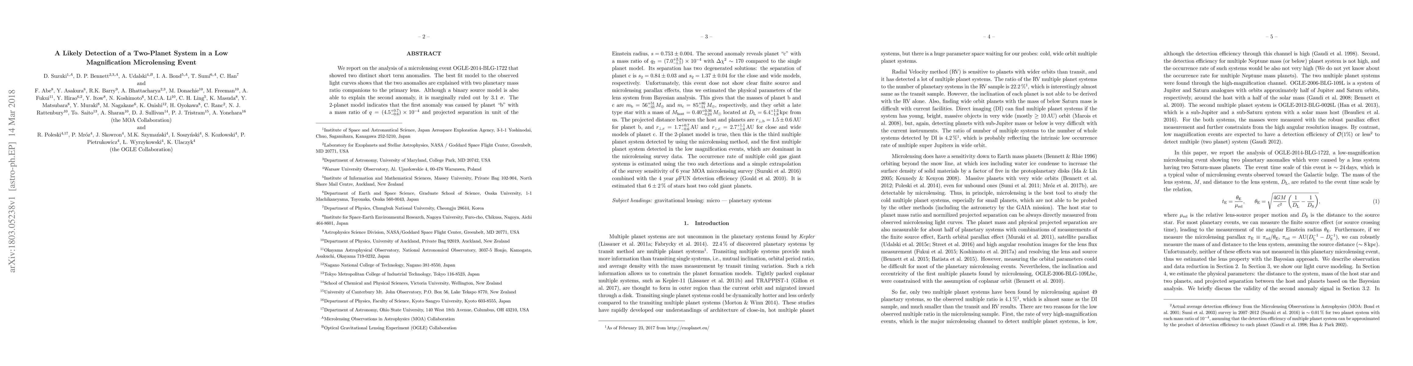 We report on the analysis of a microlensing event OGLE-2014-BLG-1722 that showed two distinct short term anomalies. The best fit model to the observed light curves shows that the two anomalies are explained with two planetary mass ratio companions to the primary lens. Although a binary source model is also able to explain the second anomaly, it is marginally ruled out by 3.1 $\sigma$. The 2-planet model indicates that the first anomaly was caused by planet "b" with a mass ratio of $q = (4.5_{-0.6}^{+0.7}) \times 10^{-4}$ and projected separation in unit of the Einstein radius, $s = 0.753 \pm 0.004$. The second anomaly reveals planet "c" with a mass ratio of $q_{2} = (7.0_{-1.7}^{+2.3}) \times 10^{-4}$ with $\Delta \chi^{2} \sim 170$ compared to the single planet model. Its separation has a so-called close-wide degeneracy. We estimated the physical parameters of the lens system from Bayesian analysis. This gives that the masses of planet b and c are $m_{\rm b} = 56_{-33}^{+51}\,M_{\oplus}$ and $m_{\rm c} = 85_{-51}^{+86}\,M_{\oplus}$, respectively, and they orbit a late type star with a mass of $M_{\rm host} = 0.40_{-0.24}^{+0.36}\,M_{\odot}$ located at $D_{\rm L} = 6.4_{-1.8}^{+1.3}\,\rm kpc$ from us. If the 2-planet model is true, this is the third multiple planet system detected by using the microlensing method, and the first multiple planet system detected in the low magnification events, which are dominant in the microlensing survey data. The occurrence rate of multiple cold gas giant systems is estimated using the two such detections and a simple extrapolation of the survey sensitivity of 6 year MOA microlensing survey (Suzuki et al. 2016) combined with the 4 year $\mu$FUN detection efficiency (Gould et al. 2010). It is estimated that $6 \pm 2\,\%$ of stars host two cold giant planets.