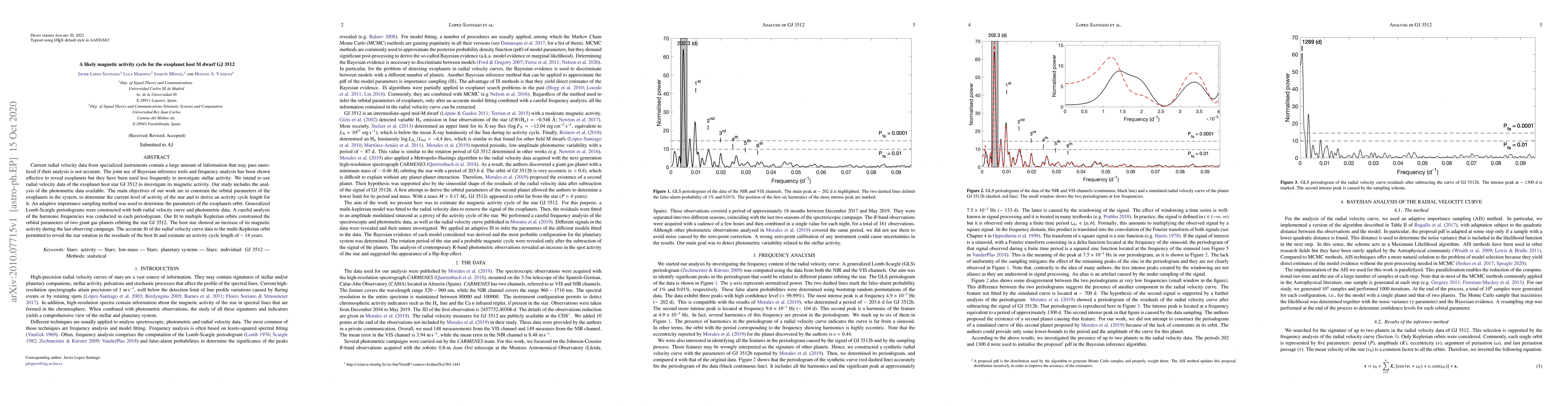 This paper uses radial velocity data and Bayesian inference to analyze the exoplanet host star GJ 3512, revealing two giant gas planets in its orbit. The study also estimates a magnetic activity cycle length of approximately 14 years for the star, indicating an increase in its magnetic activity during recent observations.