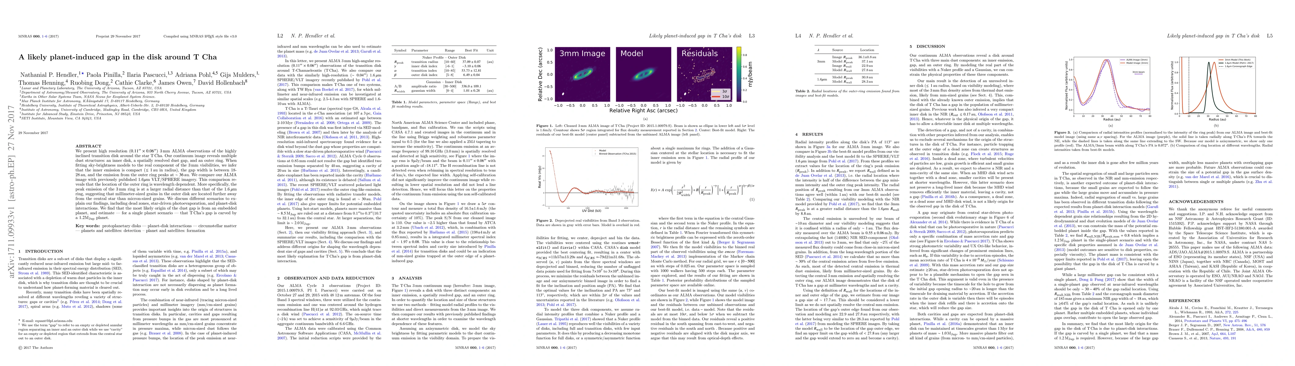 High-resolution ALMA observations reveal a dust gap in the disk around T Cha, likely induced by an embedded planet of approximately $1.2M_{jup}$ in mass. The gap width is estimated to be between 18-28 au, with millimeter-sized grains in the outer ring located further from the star than micron-sized grains.