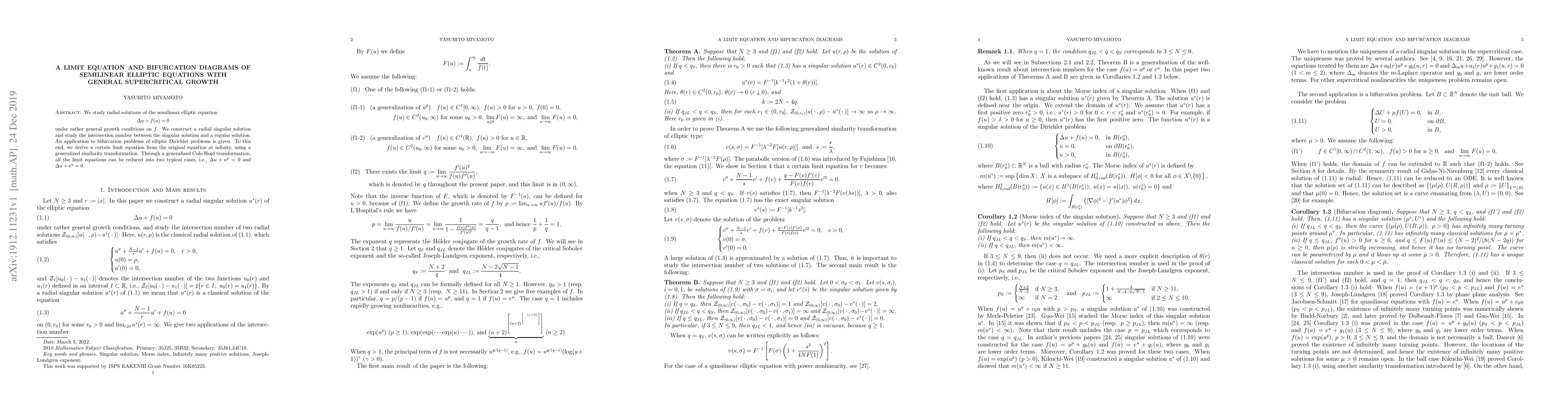 We study radial solutions of the semilinear elliptic equation $\Delta u+f(u)=0$ under rather general growth conditions on $f$. We construct a radial singular solution and study the intersection number between the singular solution and a regular solution. An application to bifurcation problems of elliptic Dirichlet problems is given. To this end, we derive a certain limit equation from the original equation at infinity, using a generalized similarity transformation. Through a generalized Cole-Hopf transformation, all the limit equations can be reduced into two typical cases, i.e., $\Delta u+u^p=0$ and $\Delta u+e^u=0$.