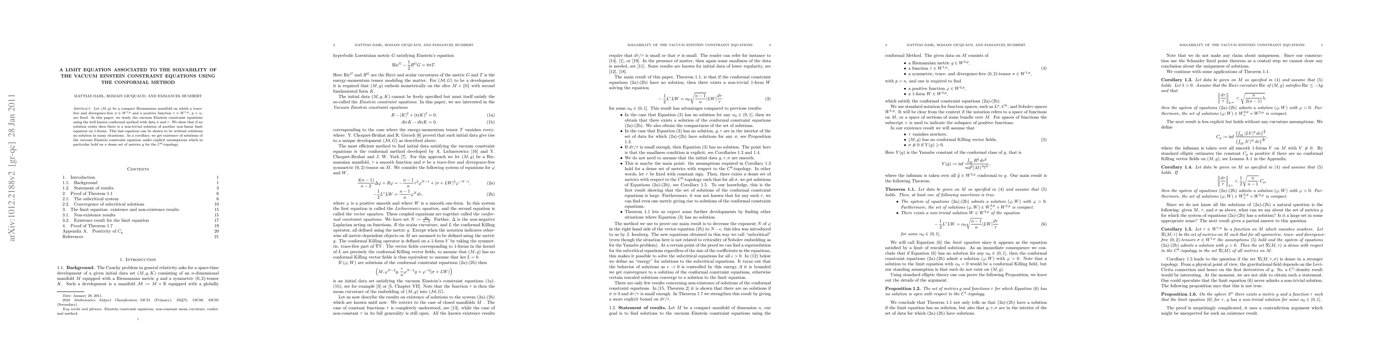 Let $(M,g)$ be a compact Riemannian manifold on which a trace-free and divergence-free $\sigma \in W^{1,p}$ and a positive function $\tau \in W^{1,p}$, $p > n$, are fixed. In this paper, we study the vacuum Einstein constraint equations using the well known conformal method with data $\sigma$ and $\tau$. We show that if no solution exists then there is a non-trivial solution of another non-linear limit equation on $1$-forms. This last equation can be shown to be without solutions no solution in many situations. As a corollary, we get existence of solutions of the vacuum Einstein constraint equation under explicit assumptions which in particular hold on a dense set of metrics $g$ for the $C^0$-topology.