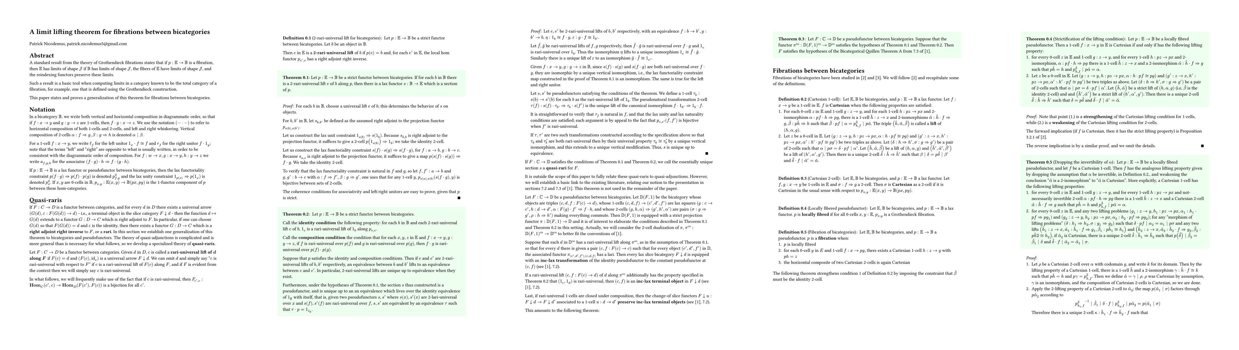 A standard result from the theory of Grothendieck fibrations states that if $p : E \to B$ is a fibration, then $E$ has limits of shape $\mathcal{J}$ if $B$ has limits of shape $\mathcal{J}$ the fibers of $\mathcal{E}$ have limits of shape $\mathcal{J}$, and the reindexing functors preserve these limits. Such a result is a basic tool when computing limits in a category known to be the total category of a fibration, for example, one that is defined using the Grothendieck construction. This paper states and proves a generalization of this theorem for fibrations between bicategories.