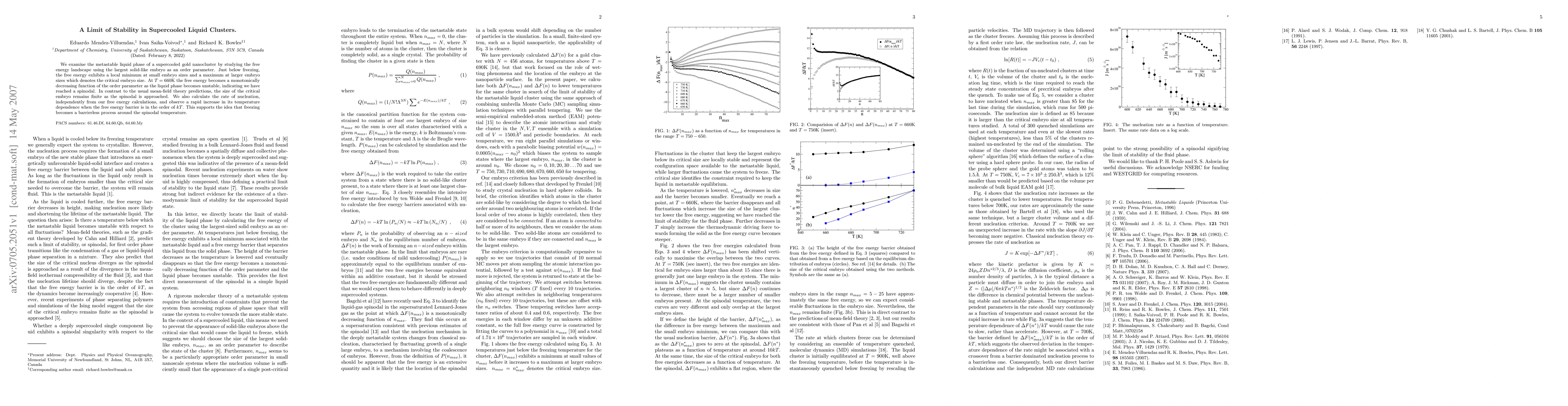 We examine the metastable liquid phase of a supercooled gold nanocluster by studying the free energy landscape using the largest solid-like embryo as an order parameter. Just below freezing, the free energy exhibits a local minimum at small embryo sizes and a maximum at larger embryo sizes which denotes the critical embryo size. At T=660K the free energy becomes a monotonically decreasing function of the order parameter as the liquid phase becomes unstable, indicating we have reached a spinodal. In contrast to the usual mean-field theory predictions, the size of the critical embryo remains finite as the spinodal is approached. We also calculate the rate of nucleation, independently from our free energy calculations, and observe a rapid increase in its temperature dependence when the free energy barrier is in the order of $kT$. This supports the idea that freezing becomes a barrierless process around the spinodal temperature.