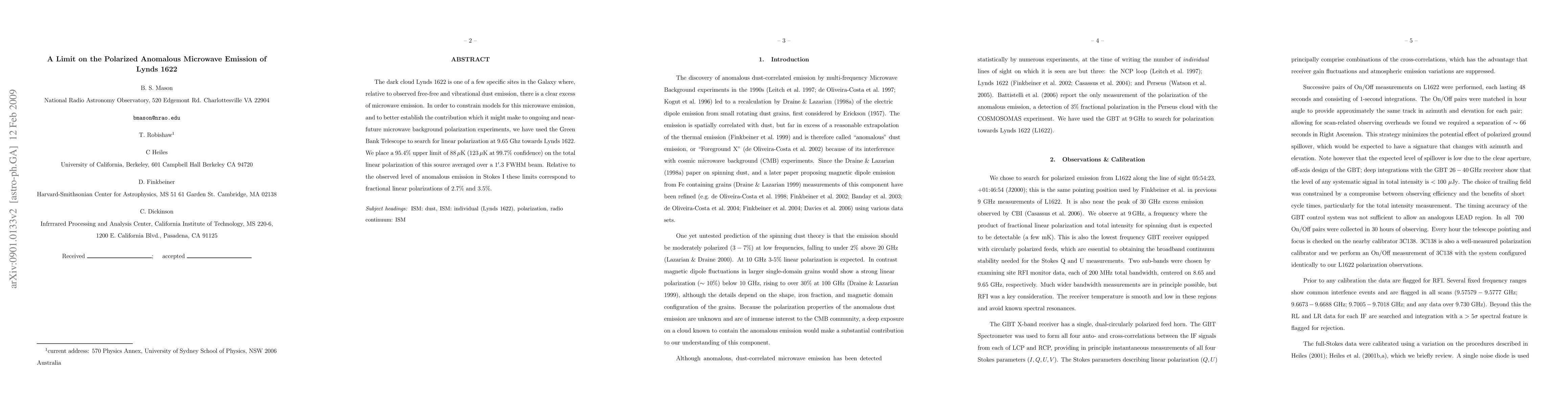 The dark cloud Lynds 1622 is one of a few specific sites in the Galaxy where, relative to observed free-free and vibrational dust emission, there is a clear excess of microwave emission. In order to constrain models for this microwave emission, and to better establish the contribution which it might make to ongoing and near-future microwave background polarization experiments, we have used the Green Bank Telescope to search for linear polarization at 9.65 Ghz towards Lynds 1622. We place a 95.4% upper limit of 88 micro-Kelvin (123 micro-Kelvin at 99.7 confidence) on the total linear polarization of this source averaged over a 1'.3 FWHM beam. Relative to the observed level of anomalous emission in Stokes I these limits correspond to fractional linear polarizations of 2.7% and 3.5%.