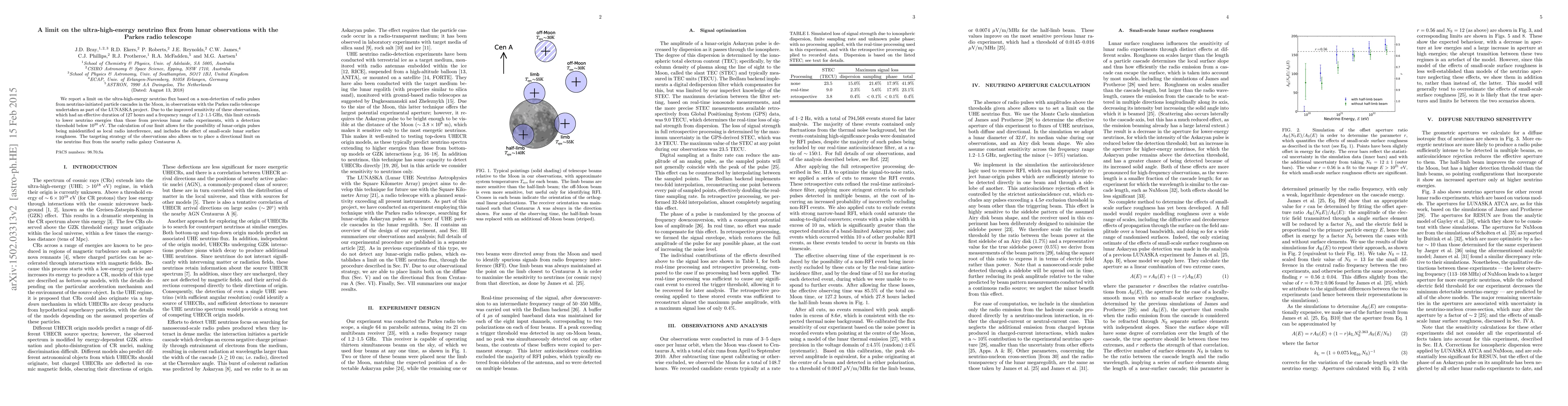 We report a limit on the ultra-high-energy neutrino flux based on a non-detection of radio pulses from neutrino-initiated particle cascades in the Moon, in observations with the Parkes radio telescope undertaken as part of the LUNASKA project. Due to the improved sensitivity of these observations, which had an effective duration of 127 hours and a frequency range of 1.2-1.5 GHz, this limit extends to lower neutrino energies than those from previous lunar radio experiments, with a detection threshold below 10^20 eV. The calculation of our limit allows for the possibility of lunar-origin pulses being misidentified as local radio interference, and includes the effect of small-scale lunar surface roughness. The targeting strategy of the observations also allows us to place a directional limit on the neutrino flux from the nearby radio galaxy Centaurus A.