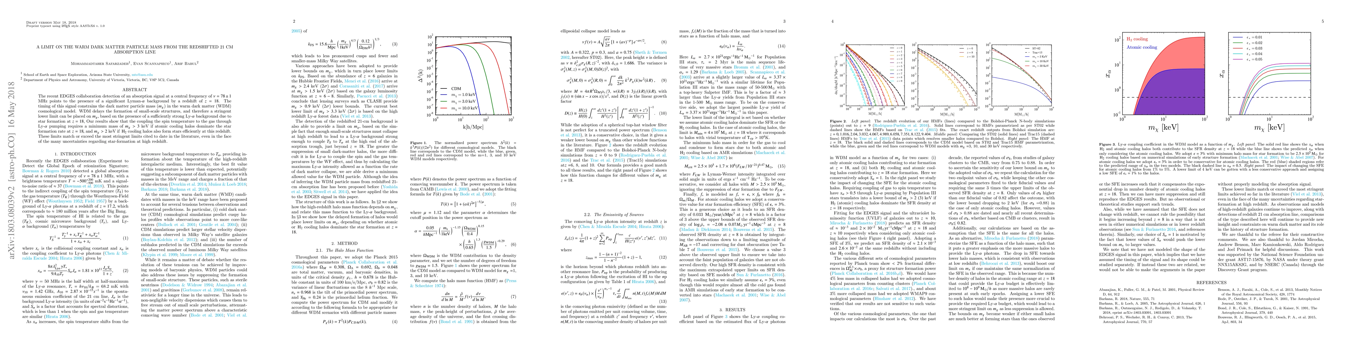 The recent EDGES collaboration detection of an absorption signal at a central frequency of $\nu = 78 \pm 1$ MHz points to the presence of a significant Lyman-$\alpha$ background by a redshift of $z=18$. The timing of this signal constrains the dark matter particle mass ($m_\chi$) in the warm dark matter (WDM) cosmological model. WDM delays the formation of small-scale structures, and therefore a stringent lower limit can be placed on $m_\chi,$ based on the presence of a sufficiently strong Ly-$\alpha$ background due to star formation at $z=18$. Our results show that the coupling the spin temperature to the gas through Ly-$\alpha$ pumping requires a minimum mass of $m_\chi>3$ keV if atomic cooling halos dominate the star formation rate at $z=18,$ and $m_\chi>2$ keV if ${\rm\,H_2}$ cooling halos also form stars efficiently at this redshift. These limits match or exceed the most stringent limits cited to date in the literature, even in the face of the many uncertainties regarding star-formation at high redshift.