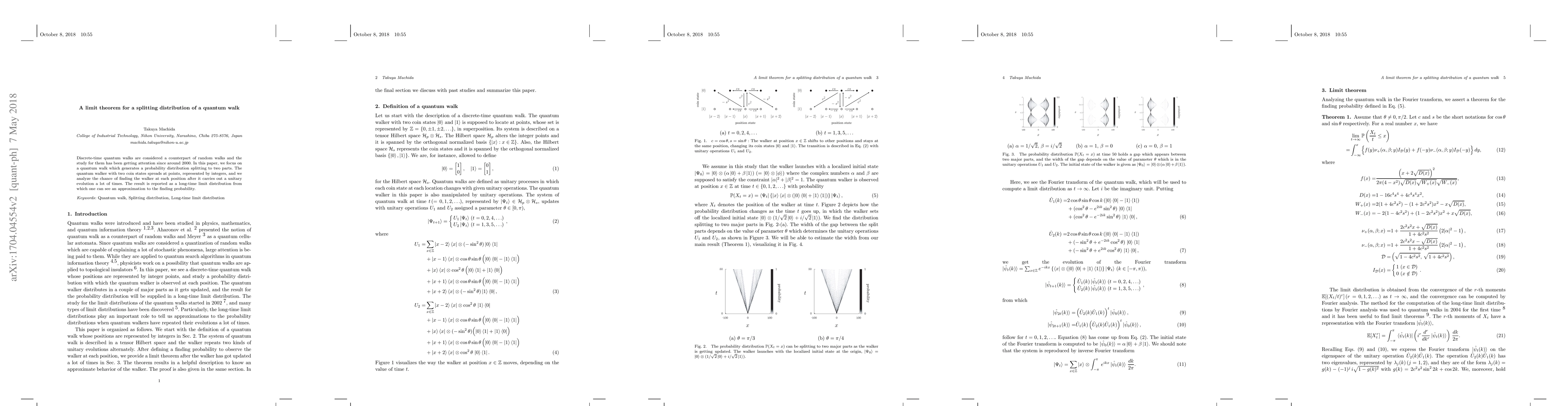 Discrete-time quantum walks are considered a counterpart of random walks and the study for them has been getting attention since around 2000. In this paper, we focus on a quantum walk which generates a probability distribution splitting to two parts. The quantum walker with two coin states spreads at points, represented by integers, and we analyze the chance of finding the walker at each position after it carries out a unitary evolution a lot of times. The result is reported as a long-time limit distribution from which one can see an approximation to the finding probability.