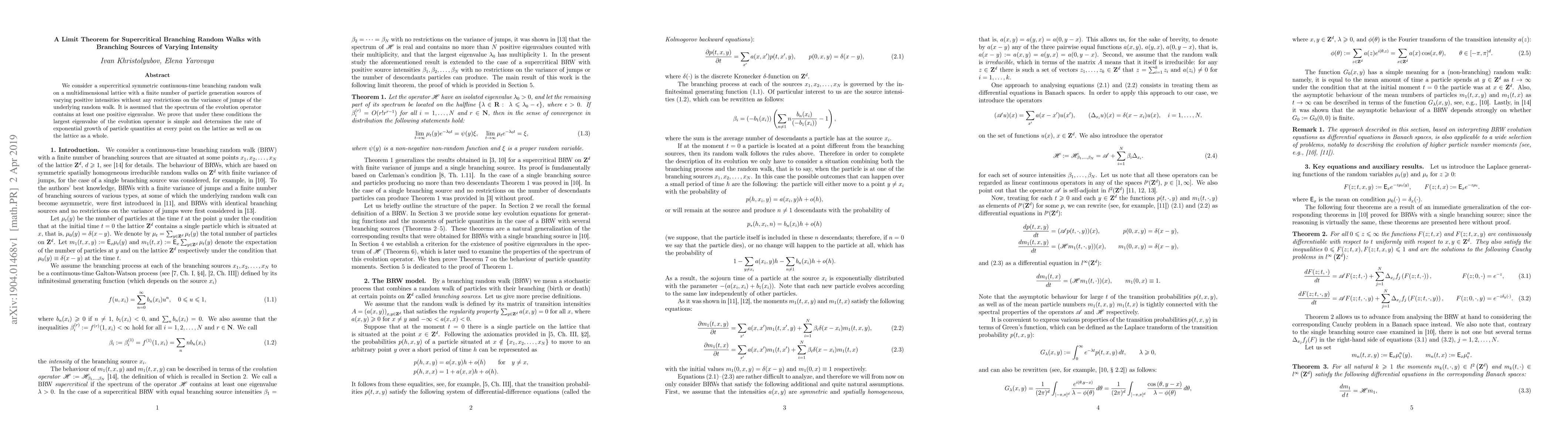 We consider a supercritical symmetric continuous-time branching random walk on a multidimensional lattice with a finite number of particle generation sources of varying positive intensities without any restrictions on the variance of jumps of the underlying random walk. It is assumed that the spectrum of the evolution operator contains at least one positive eigenvalue. We prove that under these conditions the largest eigenvalue of the evolution operator is simple and determines the rate of exponential growth of particle quantities at every point on the lattice as well as on the lattice as a whole.
