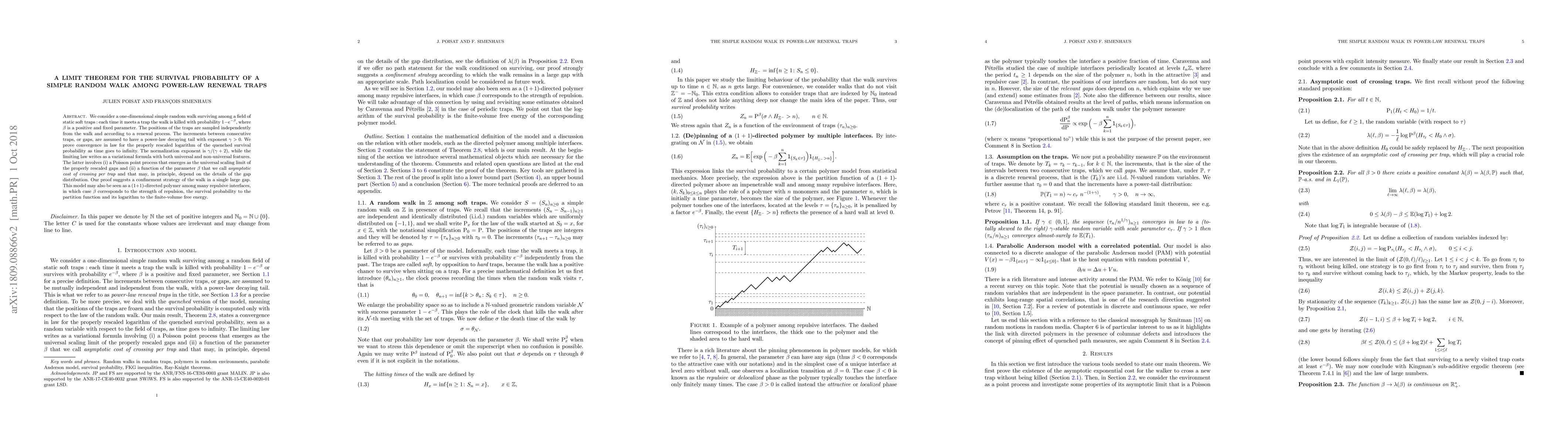 We consider a one-dimensional simple random walk surviving among a field of static soft traps : each time it meets a trap the walk is killed with probability 1--e --$\beta$ , where $\beta$ is a positive and fixed parameter. The positions of the traps are sampled independently from the walk and according to a renewal process. The increments between consecutive traps, or gaps, are assumed to have a power-law decaying tail with exponent $\gamma$ > 0. We prove convergence in law for the properly rescaled logarithm of the quenched survival probability as time goes to infinity. The normalization exponent is $\gamma$/($\gamma$ + 2), while the limiting law writes as a variational formula with both universal and non-universal features. The latter involves (i) a Poisson point process that emerges as the universal scaling limit of the properly rescaled gaps and (ii) a function of the parameter $\beta$ that we call asymptotic cost of crossing per trap and that may, in principle, depend on the details of the gap distribution. Our proof suggests a confinement strategy of the walk in a single large gap. This model may also be seen as a (1 + 1)-directed polymer among many repulsive interfaces, in which case $\beta$ corresponds to the strength of repulsion, the survival probability to the partition function and its logarithm to the finite-volume free energy. Along the way we prove a stochastic monotonicity property for the hitting time of the killed random walk with respect to the non-killed one, that could be of interest in other contexts, see Proposition 3.5.