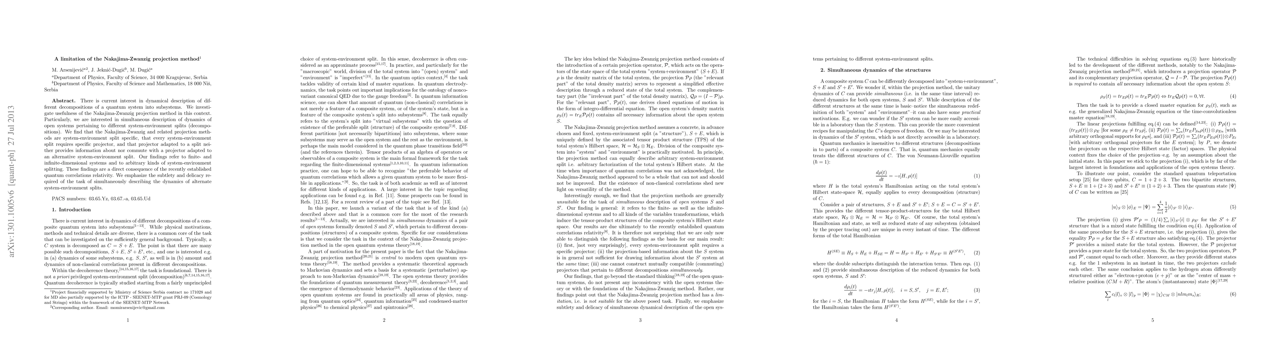 This paper identifies a limitation of the Nakajima-Zwanzig projection method, revealing that it is specific to particular system-environment splits and cannot simultaneously describe dynamics across different splits. The findings highlight the challenges posed by quantum correlations relativity in describing open quantum systems.
