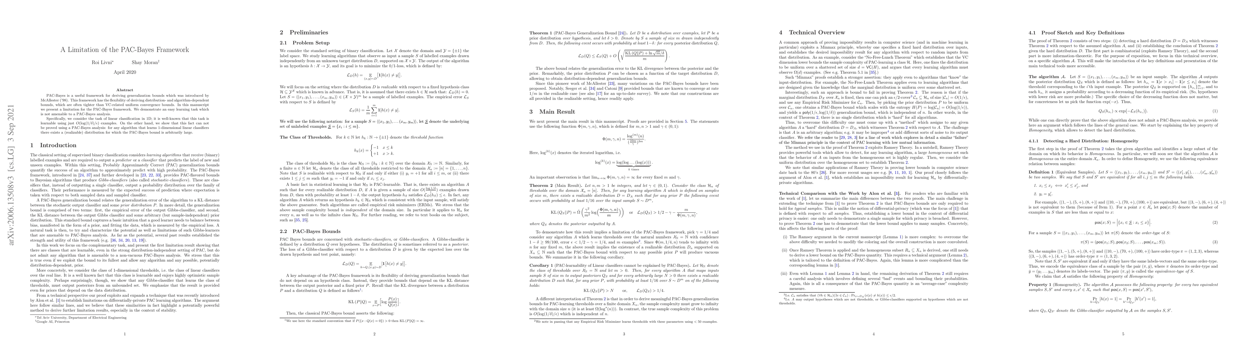 This paper highlights a limitation of the PAC-Bayes framework by demonstrating that it fails to derive tight generalization bounds for a simple 1D linear classification task, despite the task being easily learnable with few examples. Specifically, the authors show that PAC-Bayes bounds become arbitrarily large for certain distributions.