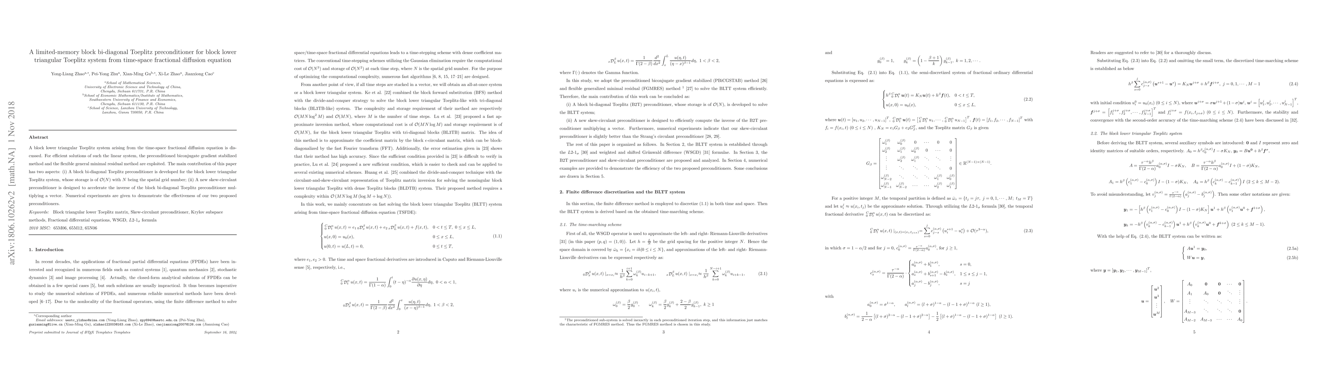 This paper develops a limited-memory block bi-diagonal Toeplitz preconditioner for solving block lower triangular Toeplitz systems from time-space fractional diffusion equations. It also introduces a skew-circulant preconditioner for efficiently computing the inverse, demonstrating improved performance through numerical experiments.