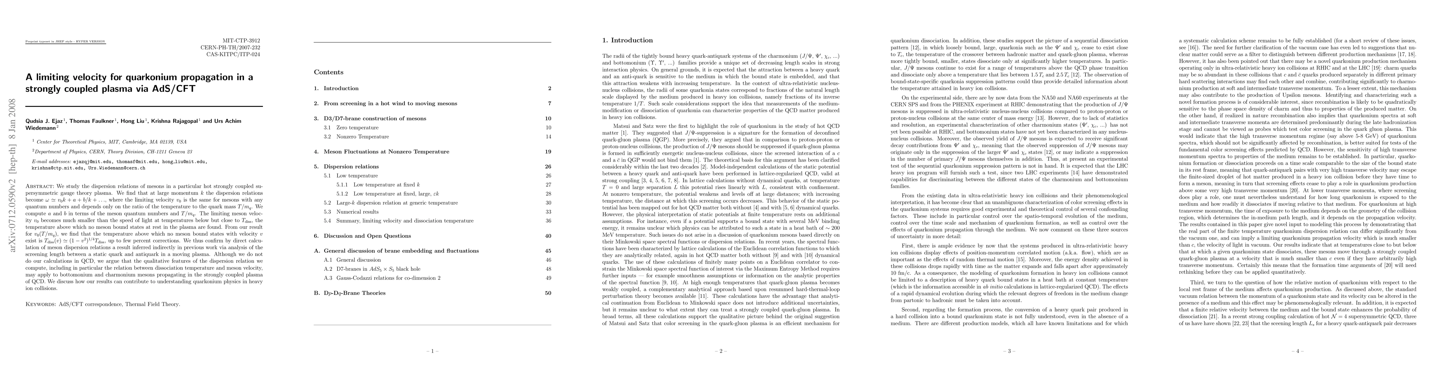 We study the dispersion relations of mesons in a particular hot strongly coupled supersymmetric gauge theory plasma. We find that at large momentum k the dispersion relations become omega = v_0 k + a + b/k + ..., where the limiting velocity v_0 is the same for mesons with any quantum numbers and depends only on the ratio of the temperature to the quark mass T/m_q. We compute a and b in terms of the meson quantum numbers and T/m_q. The limiting meson velocity v_0 becomes much smaller than the speed of light at temperatures below but close to T_diss, the temperature above which no meson bound states at rest in the plasma are found. From our result for v_0, we find that the temperature above which no meson bound states with velocity v exist is T_diss(v) \simeq (1-v^2)^(1/4) T_diss, up to few percent corrections.We thus confirm by direct calculation of meson dispersion relations a result inferred indirectly in previous work via analysis of the screening length between a static quark and antiquark in a moving plasma. Although we do not do our calculations in QCD, we argue that the qualitative features of the dispersion relation we compute, including in particular the relation between dissociation temperature and meson velocity, may apply to bottomonium and charmonium mesons propagating in the strongly coupled plasma of QCD. We discuss how our results can contribute to understanding quarkonium physics in heavy ion collisions.