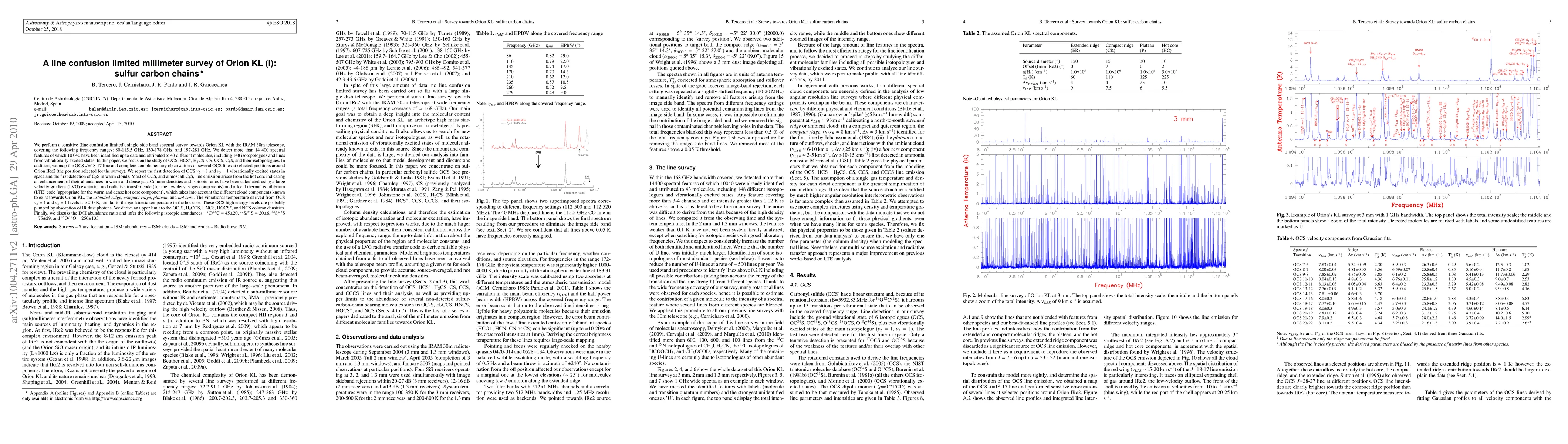 We perform a sensitive (line confusion limited), single-side band spectral survey towards Orion KL with the IRAM 30m telescope, covering the following frequency ranges: 80-115.5 GHz, 130-178 GHz, and 197-281 GHz. We detect more than 14 400 spectral features of which 10 040 have been identified up to date and attributed to 43 different molecules, including 148 isotopologues and lines from vibrationally excited states. In this paper, we focus on the study of OCS, HCS+, H2CS, CS, CCS, C3S, and their isotopologues. In addition, we map the OCS J=18-17 line and complete complementary observations of several OCS lines at selected positions around Orion IRc2 (the position selected for the survey). We report the first detection of OCS v2 = 1 and v3 = 1 vibrationally excited states in space and the first detection of C3S in warm clouds. Most of CCS, and almost all C3S, line emission arises from the hot core indicating an enhancement of their abundances in warm and dense gas. Column densities and isotopic ratios have been calculated using a large velocity gradient (LVG) excitation and radiative transfer code (for the low density gas components) and a local thermal equilibrium (LTE) code (appropriate for the warm and dense hot core component), which takes into account the different cloud components known to exist towards Orion KL, the extended ridge, compact ridge, plateau, and hot core. The vibrational temperature derived from OCS v2 = 1 and v3 = 1 levels is about 210 K, similar to the gas kinetic temperature in the hot core. These OCS high energy levels are probably pumped by absorption of IR dust photons. We derive an upper limit to the OC3S, H2CCS, HNCS, HOCS+, and NCS column densities. Finally, we discuss the D/H abundance ratio and infer the following isotopic abundances: 12C/13C=45+-20, 32S/34S=20+-6, 32S/33S=75+-29, and 16O/18O=250+-135.