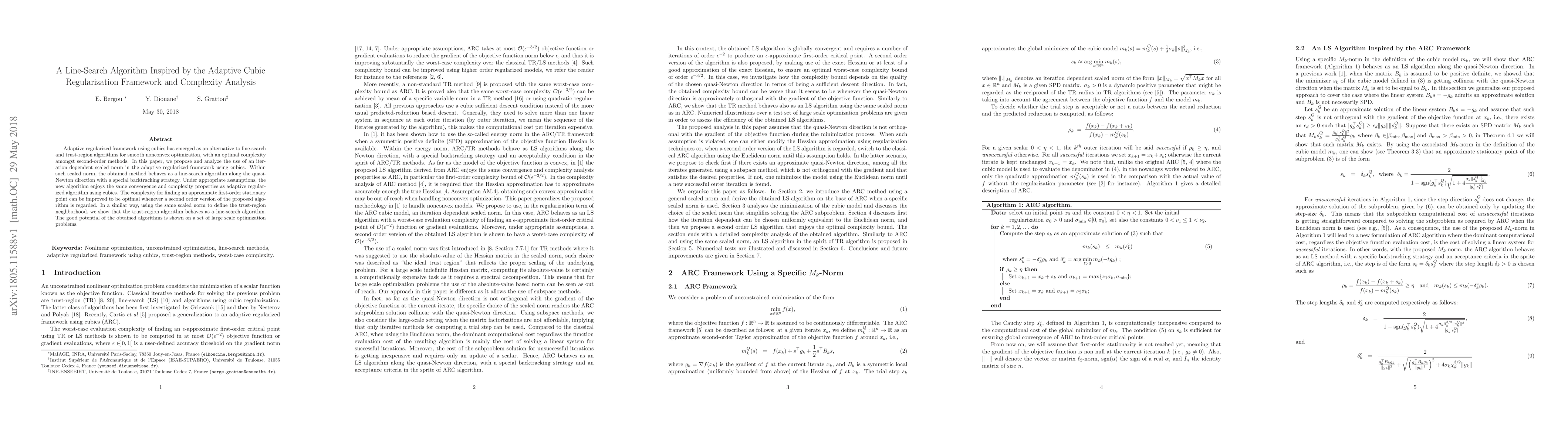 A new optimization algorithm inspired by adaptive regularization using cubics is proposed, which behaves like a line-search algorithm in certain conditions, offering improved convergence and complexity properties for large-scale problems.