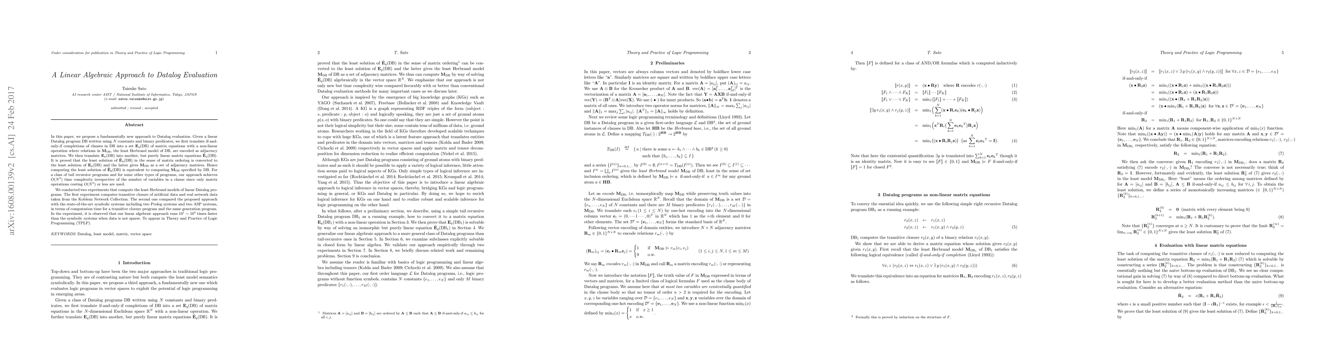 In this paper, we propose a fundamentally new approach to Datalog evaluation. Given a linear Datalog program DB written using N constants and binary predicates, we first translate if-and-only-if completions of clauses in DB into a set Eq(DB) of matrix equations with a non-linear operation where relations in M_DB, the least Herbrand model of DB, are encoded as adjacency matrices. We then translate Eq(DB) into another, but purely linear matrix equations tilde_Eq(DB). It is proved that the least solution of tilde_Eq(DB) in the sense of matrix ordering is converted to the least solution of Eq(DB) and the latter gives M_DB as a set of adjacency matrices. Hence computing the least solution of tilde_Eq(DB) is equivalent to computing M_DB specified by DB. For a class of tail recursive programs and for some other types of programs, our approach achieves O(N^3) time complexity irrespective of the number of variables in a clause since only matrix operations costing O(N^3) or less are used. We conducted two experiments that compute the least Herbrand models of linear Datalog programs. The first experiment computes transitive closure of artificial data and real network data taken from the Koblenz Network Collection. The second one compared the proposed approach with the state-of-the-art symbolic systems including two Prolog systems and two ASP systems, in terms of computation time for a transitive closure program and the same generation program. In the experiment, it is observed that our linear algebraic approach runs 10^1 ~ 10^4 times faster than the symbolic systems when data is not sparse. To appear in Theory and Practice of Logic Programming (TPLP).