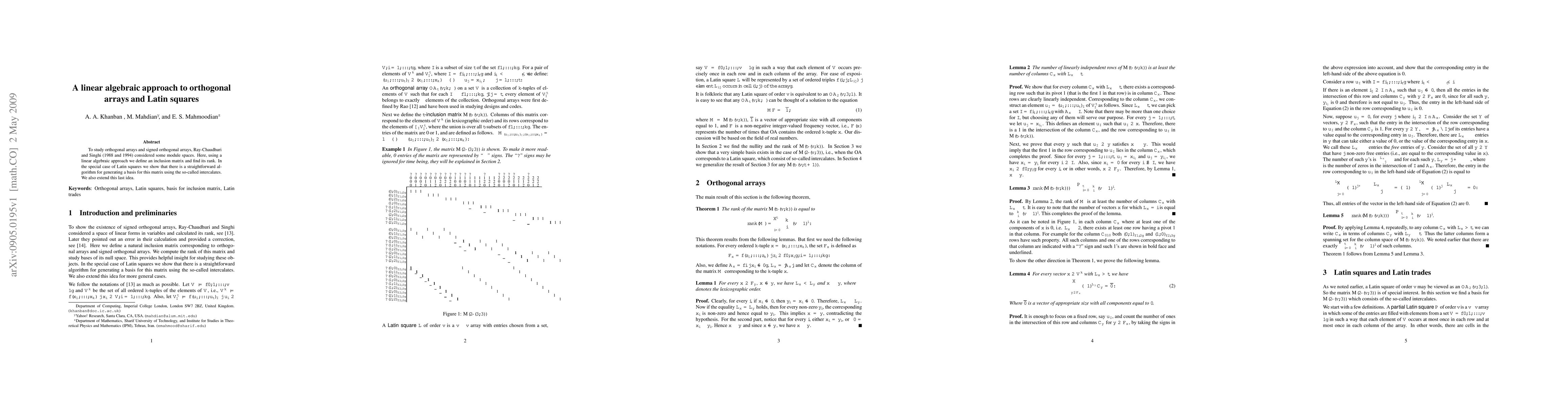This paper employs a linear algebraic approach to study orthogonal arrays and Latin squares, defining an inclusion matrix and determining its rank. It presents an algorithm for generating a basis for the matrix in the case of Latin squares using intercalates.