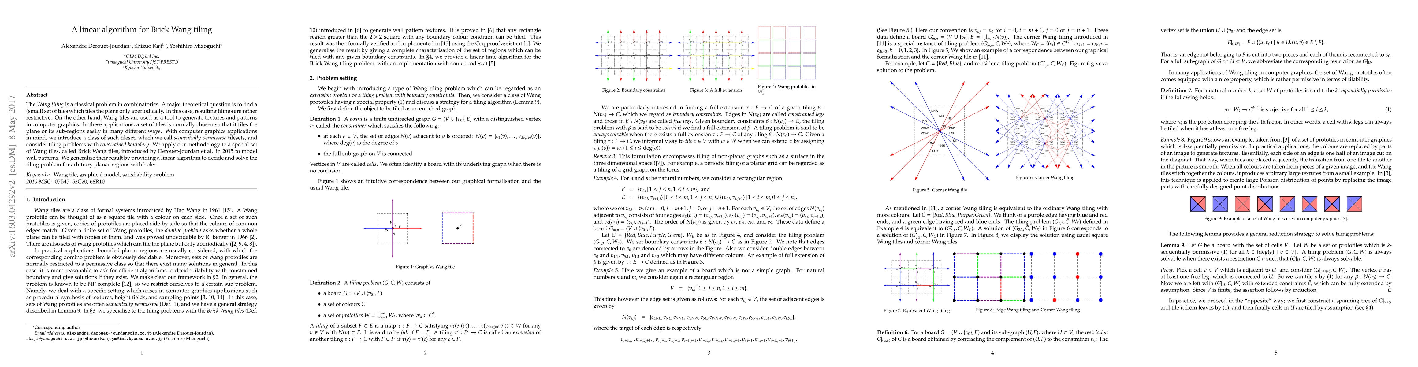 This paper presents a linear algorithm for solving the tiling problem using Brick Wang tiles, a specialized set of Wang tiles used to model wall patterns. The authors introduce sequentially permissive tilesets and provide a solution for tiling arbitrary planar regions with holes, extending previous results.