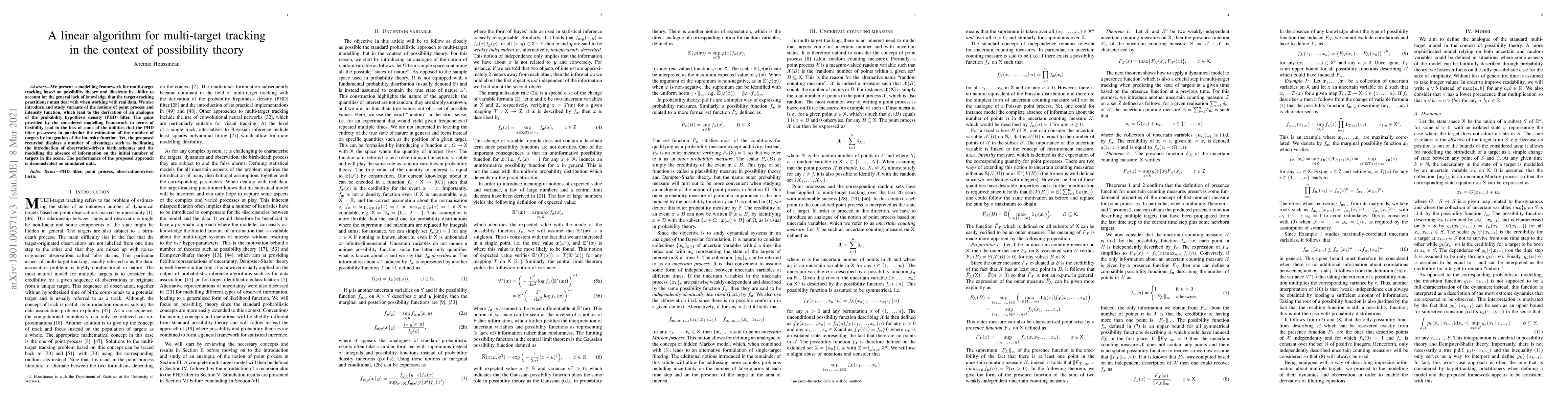 This paper proposes a linear algorithm for multi-target tracking using possibility theory, offering flexibility over traditional methods like the PHD filter by accommodating uncertainty and unknown initial conditions. The approach is demonstrated to work effectively on simulated data.