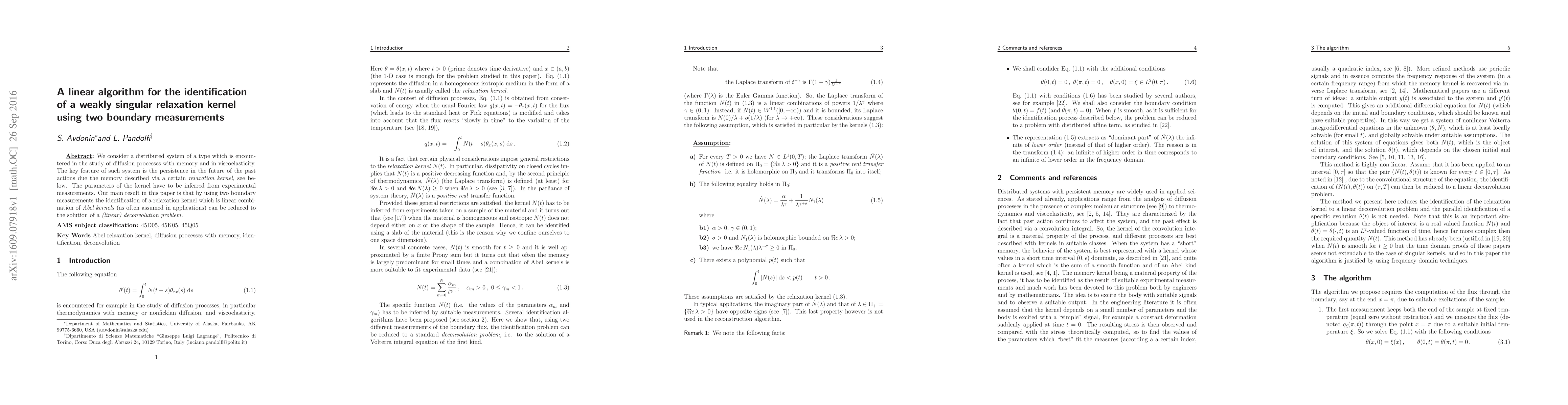 Researchers developed a linear algorithm to identify a weakly singular relaxation kernel using just two boundary measurements, reducing the problem to a deconvolution problem.