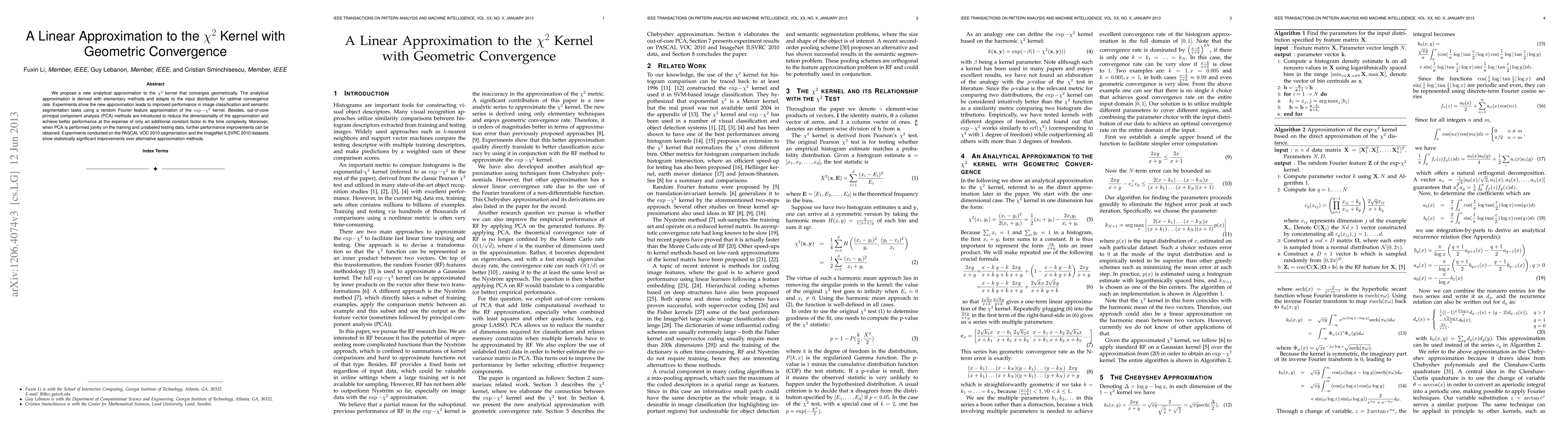 We propose a new analytical approximation to the $\chi^2$ kernel that converges geometrically. The analytical approximation is derived with elementary methods and adapts to the input distribution for optimal convergence rate. Experiments show the new approximation leads to improved performance in image classification and semantic segmentation tasks using a random Fourier feature approximation of the $\exp-\chi^2$ kernel. Besides, out-of-core principal component analysis (PCA) methods are introduced to reduce the dimensionality of the approximation and achieve better performance at the expense of only an additional constant factor to the time complexity. Moreover, when PCA is performed jointly on the training and unlabeled testing data, further performance improvements can be obtained. Experiments conducted on the PASCAL VOC 2010 segmentation and the ImageNet ILSVRC 2010 datasets show statistically significant improvements over alternative approximation methods.