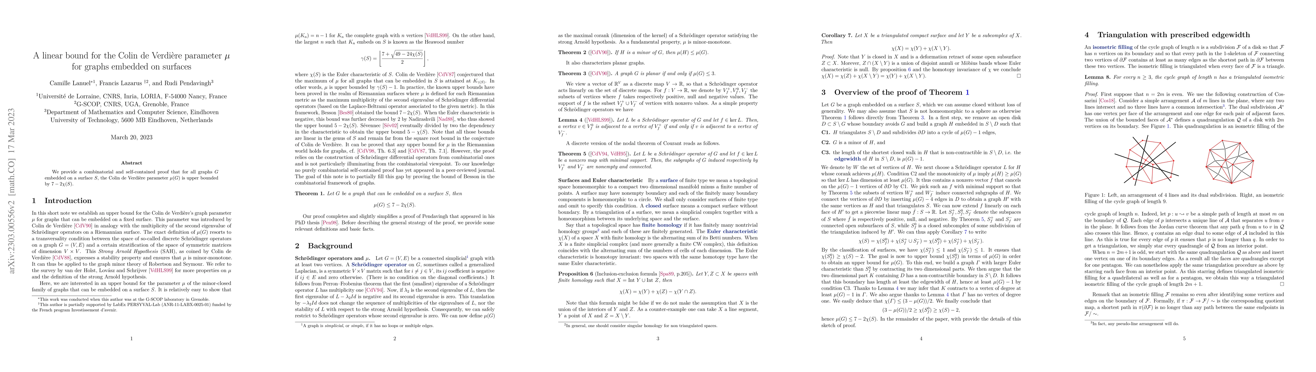 Summary: This paper proves that the Colin de Verdière parameter $\mu(G)$ for any graph $G$ embedded on a surface $S$ is bounded above by $7-2\chi(S)$, offering a combinatorial and self-contained approach to the result.