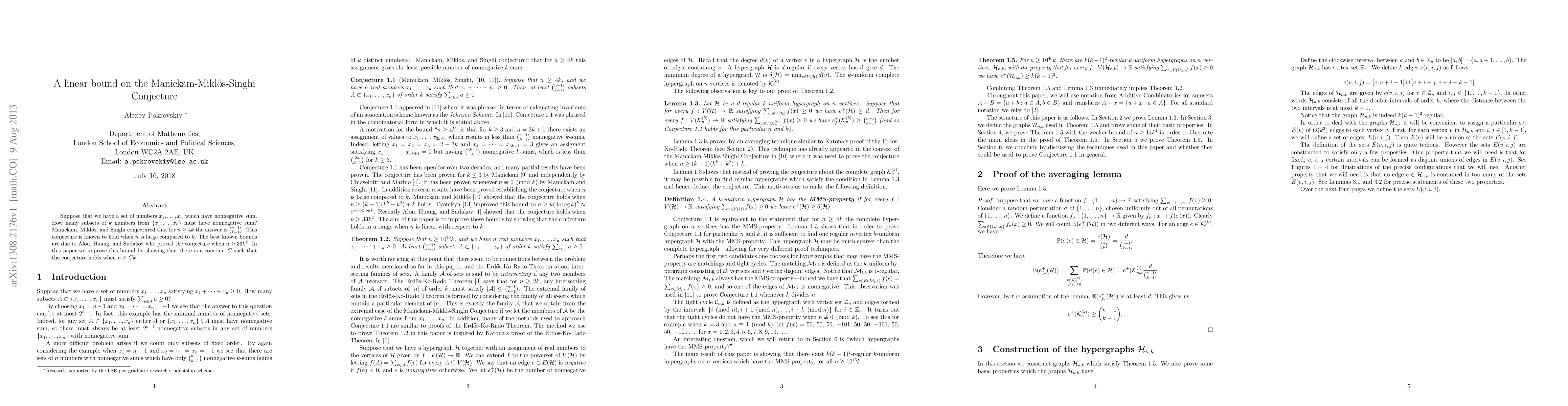 Suppose that we have a set of numbers x_1, ..., x_n which have nonnegative sum. How many subsets of k numbers from {x_1, ..., x_n} must have nonnegative sum? Manickam, Miklos, and Singhi conjectured that for n at least 4k the answer is (n-1 \choose k-1). This conjecture is known to hold when n is large compared to k. The best known bounds are due to Alon, Huang, and Sudakov who proved the conjecture when n > 33k^2. In this paper we improve this bound by showing that there is a constant C such that the conjecture holds when n > Ck.
