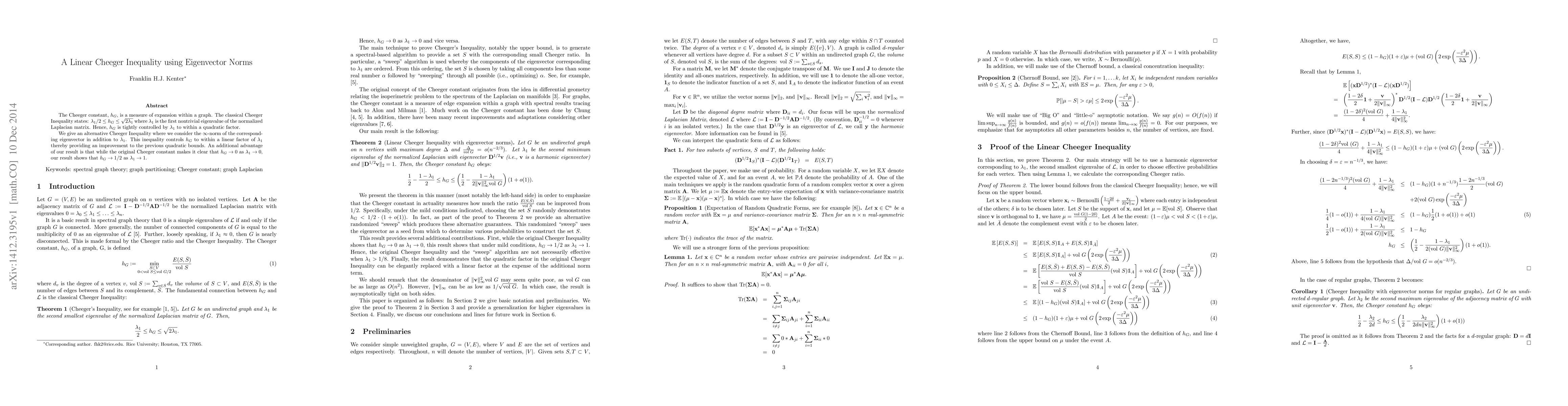 The Cheeger constant, $h_G$, is a measure of expansion within a graph. The classical Cheeger Inequality states: $\lambda_{1}/2 \le h_G \le \sqrt{2 \lambda_{1}}$ where $\lambda_1$ is the first nontrivial eigenvalue of the normalized Laplacian matrix. Hence, $h_G$ is tightly controlled by $\lambda_1$ to within a quadratic factor. We give an alternative Cheeger Inequality where we consider the $\infty$-norm of the corresponding eigenvector in addition to $\lambda_1$. This inequality controls $h_G$ to within a linear factor of $\lambda_1$ thereby providing an improvement to the previous quadratic bounds. An additional advantage of our result is that while the original Cheeger constant makes it clear that $h_G \to 0$ as $\lambda_1 \to 0$, our result shows that $h_G \to 1/2$ as $\lambda_1 \to 1$.