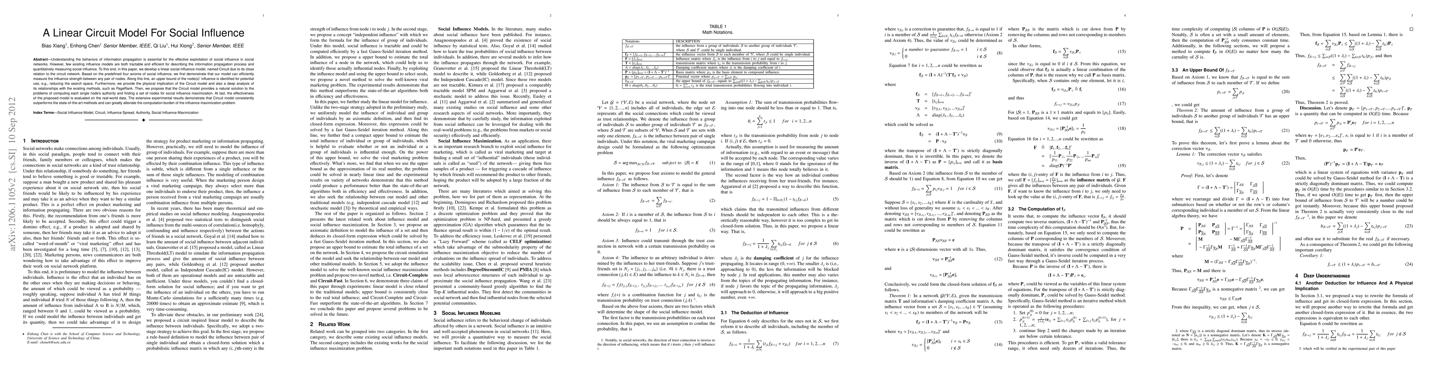 This paper introduces a linear social influence model called Circuit, which efficiently measures influence strength between nodes in social networks based on predefined axioms. The model outperforms existing methods and reduces computation burdens for influence maximization, as demonstrated through experiments on real-world data.