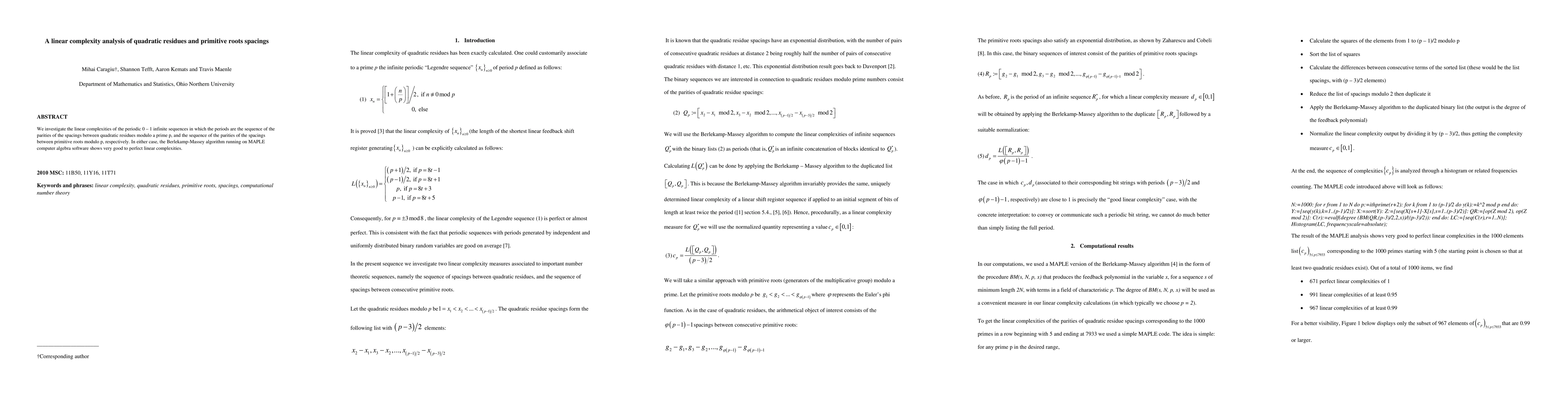 We investigate the linear complexities of the periodic 0-1 infinite sequences in which the periods are the sequence of the parities of the spacings between quadratic residues modulo a prime p, and the sequence of the parities of the spacings between primitive roots modulo p, respectively. In either case, the Berlekamp-Massey algorithm running on MAPLE computer algebra software shows very good to perfect linear complexities.