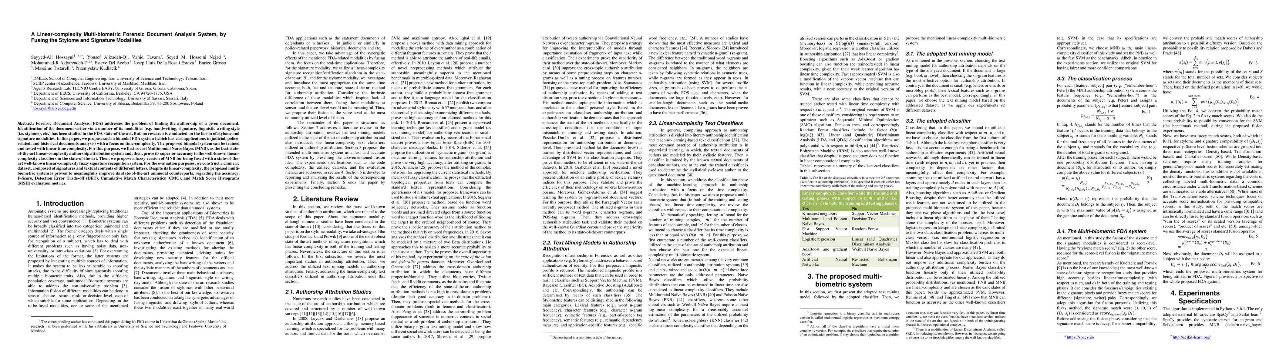 This paper introduces a linear-complexity system that combines stylometric and signature analysis for forensic document examination, significantly improving accuracy over unimodal methods. It revisits Multinomial Naive Bayes and proposes a fuzzy version for fusion with a linear-complexity signature recognition system.