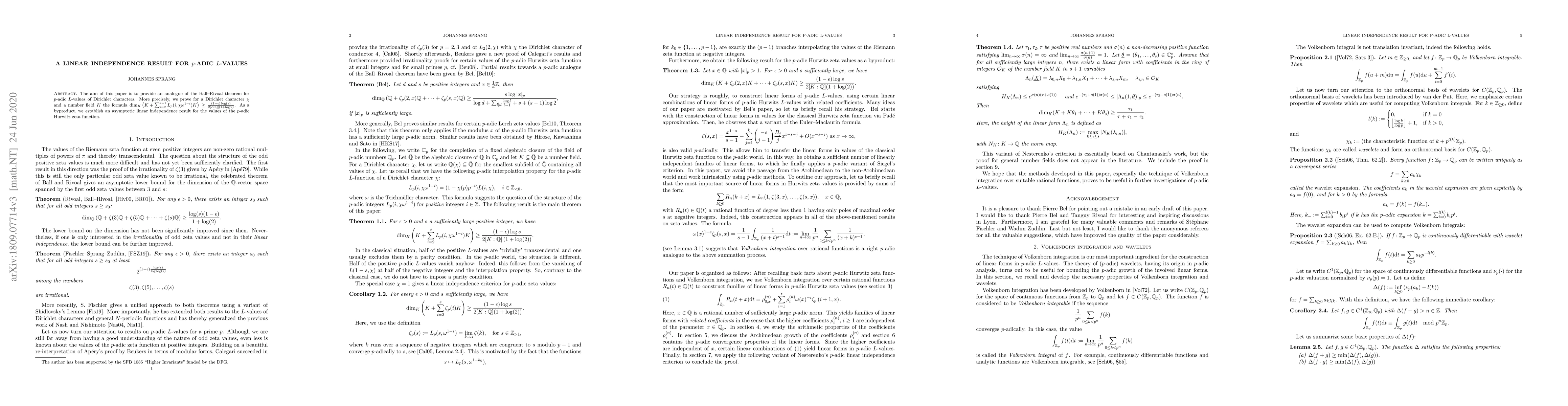 This paper establishes a linear independence result for $p$-adic $L$-values of Dirichlet characters, analogous to the Ball-Rivoal theorem, and proves an asymptotic linear independence for the $p$-adic Hurwitz zeta function values.