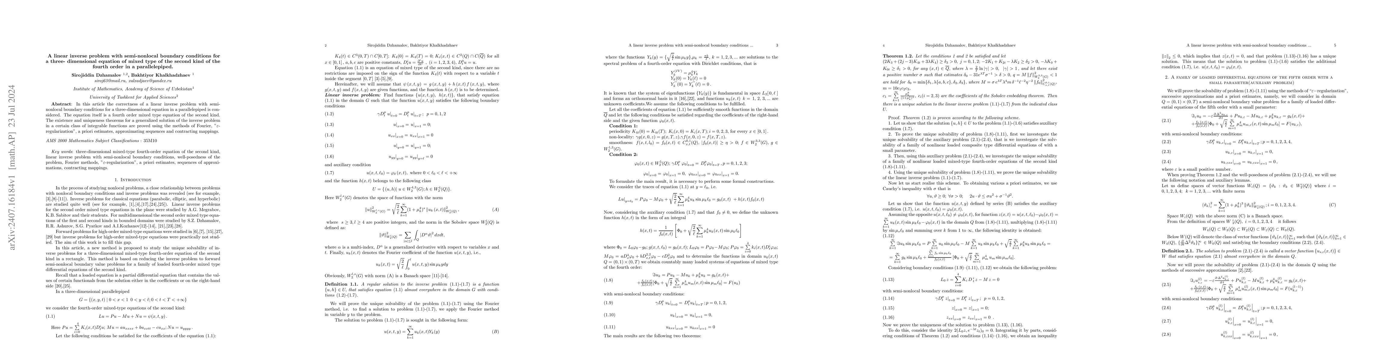 In this article the correctness of al inear inverse problem with semi-nonlocal boundary conditions for a three-dimensional equation in a parallelepiped is considered. The equation itself is a fourth order mixed type equation of the second kind. The existence and uniqueness theorems for a generalized solution of the inverse problem in a certain class of integrable functions are~proved using the methods of Fourier, "$\varepsilon $-regularization", a priori estimates, approximating sequences and contracting mappings.