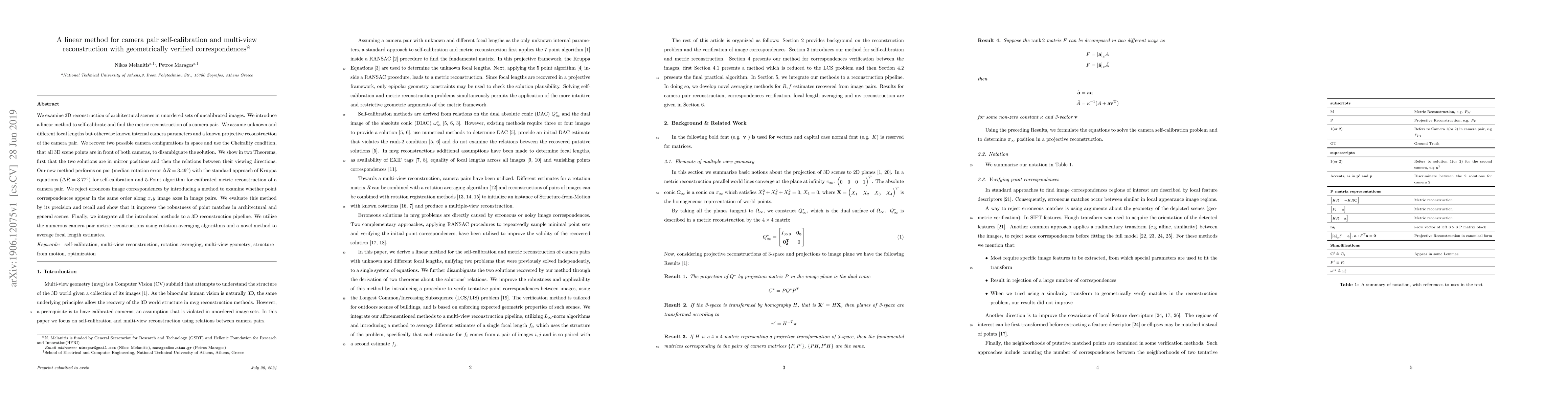 We examine 3D reconstruction of architectural scenes in unordered sets of uncalibrated images. We introduce a linear method to self-calibrate and find the metric reconstruction of a camera pair. We assume unknown and different focal lengths but otherwise known internal camera parameters and a known projective reconstruction of the camera pair. We recover two possible camera configurations in space and use the Cheirality condition, that all 3D scene points are in front of both cameras, to disambiguate the solution. We show in two Theorems, first that the two solutions are in mirror positions and then the relations between their viewing directions. Our new method performs on par (median rotation error $\Delta R = 3.49^{\circ}$) with the standard approach of Kruppa equations ($\Delta R = 3.77^{\circ}$) for self-calibration and 5-Point algorithm for calibrated metric reconstruction of a camera pair. We reject erroneous image correspondences by introducing a method to examine whether point correspondences appear in the same order along $x, y$ image axes in image pairs. We evaluate this method by its precision and recall and show that it improves the robustness of point matches in architectural and general scenes. Finally, we integrate all the introduced methods to a 3D reconstruction pipeline. We utilize the numerous camera pair metric recontructions using rotation-averaging algorithms and a novel method to average focal length estimates.