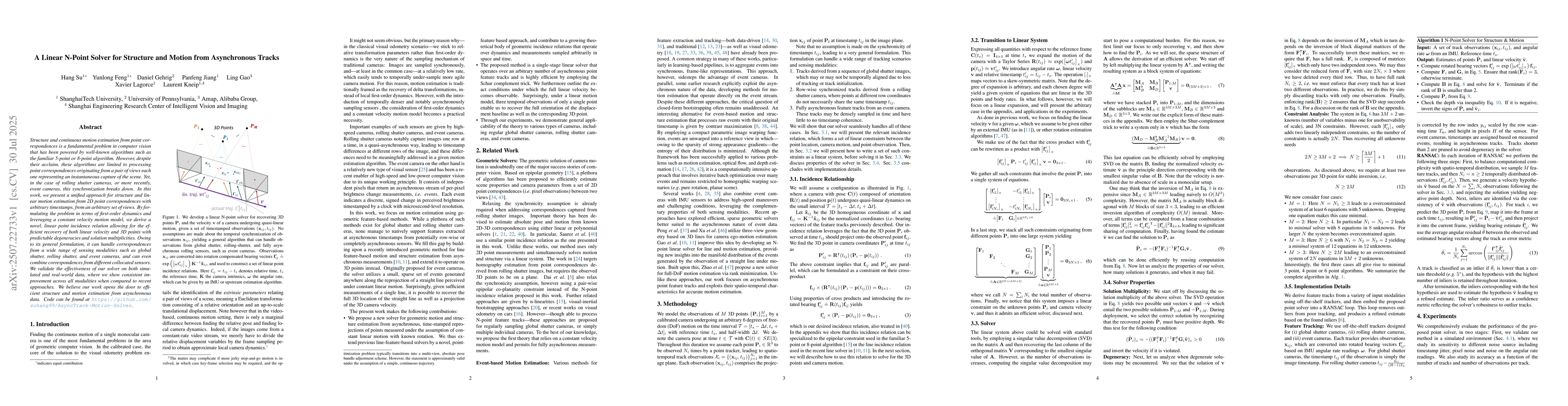The paper presents a linear N-point solver for estimating structure and linear motion from 2D point correspondences with arbitrary timestamps from various views, including global shutter, rolling shutter, and event cameras.