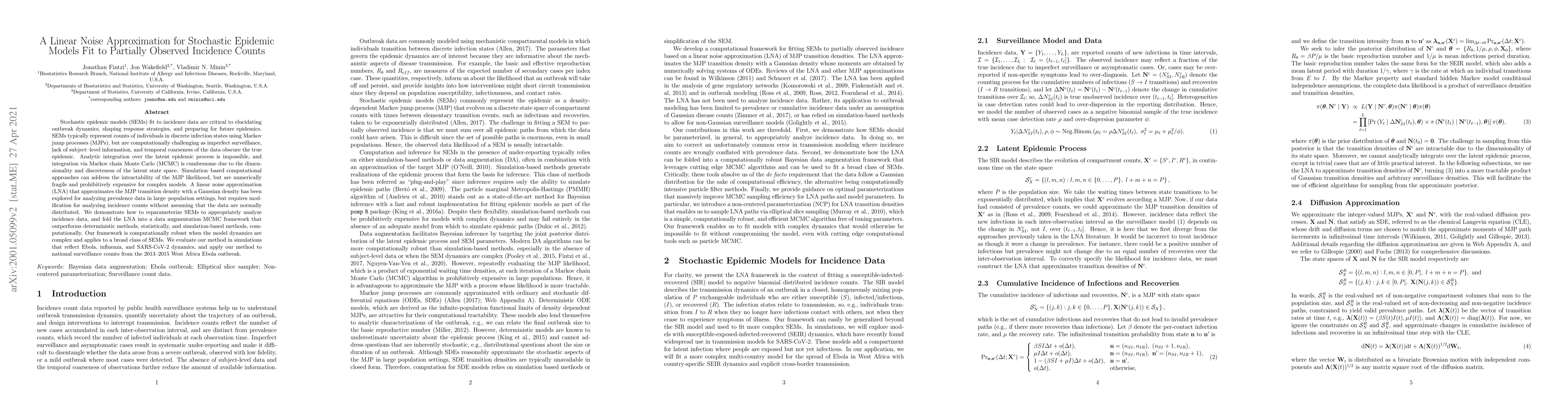 Stochastic epidemic models (SEMs) fit to incidence data are critical to elucidating outbreak dynamics, shaping response strategies, and preparing for future epidemics. SEMs typically represent counts of individuals in discrete infection states using Markov jump processes (MJPs), but are computationally challenging as imperfect surveillance, lack of subject-level information, and temporal coarseness of the data obscure the true epidemic. Analytic integration over the latent epidemic process is impossible, and integration via Markov chain Monte Carlo (MCMC) is cumbersome due to the dimensionality and discreteness of the latent state space. Simulation-based computational approaches can address the intractability of the MJP likelihood, but are numerically fragile and prohibitively expensive for complex models. A linear noise approximation (LNA) that approximates the MJP transition density with a Gaussian density has been explored for analyzing prevalence data in large-population settings, but requires modification for analyzing incidence counts without assuming that the data are normally distributed. We demonstrate how to reparameterize SEMs to appropriately analyze incidence data, and fold the LNA into a data augmentation MCMC framework that outperforms deterministic methods, statistically, and simulation-based methods, computationally. Our framework is computationally robust when the model dynamics are complex and applies to a broad class of SEMs. We evaluate our method in simulations that reflect Ebola, influenza, and SARS-CoV-2 dynamics, and apply our method to national surveillance counts from the 2013--2015 West Africa Ebola outbreak.