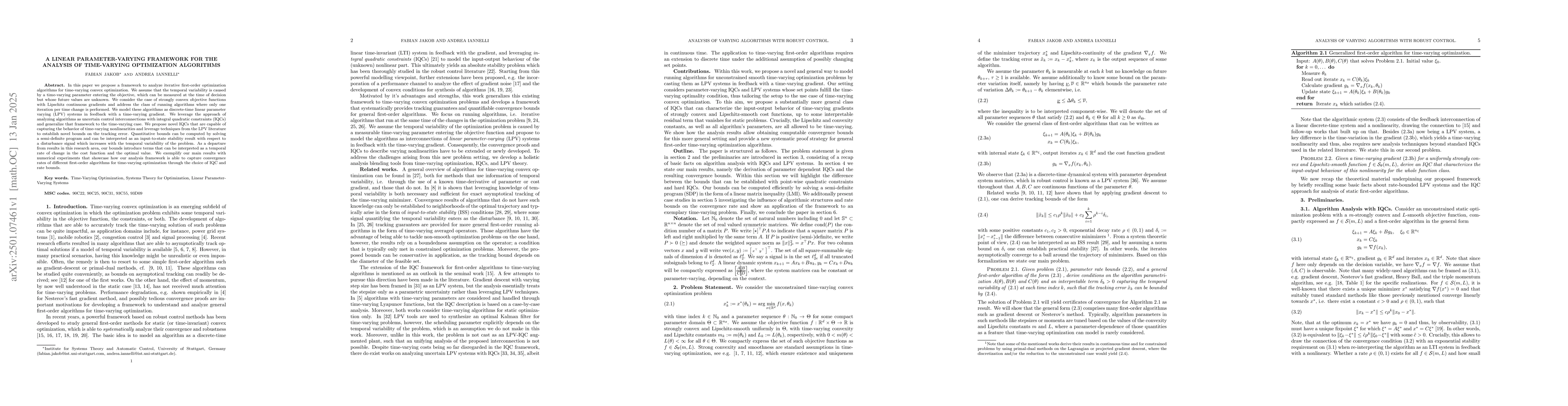 This paper introduces a linear parameter-varying framework to analyze iterative first-order optimization algorithms for time-varying convex optimization, establishing novel bounds on tracking error via integral quadratic constraints and semi-definite programming. It showcases how this approach captures convergence rates through numerical experiments.