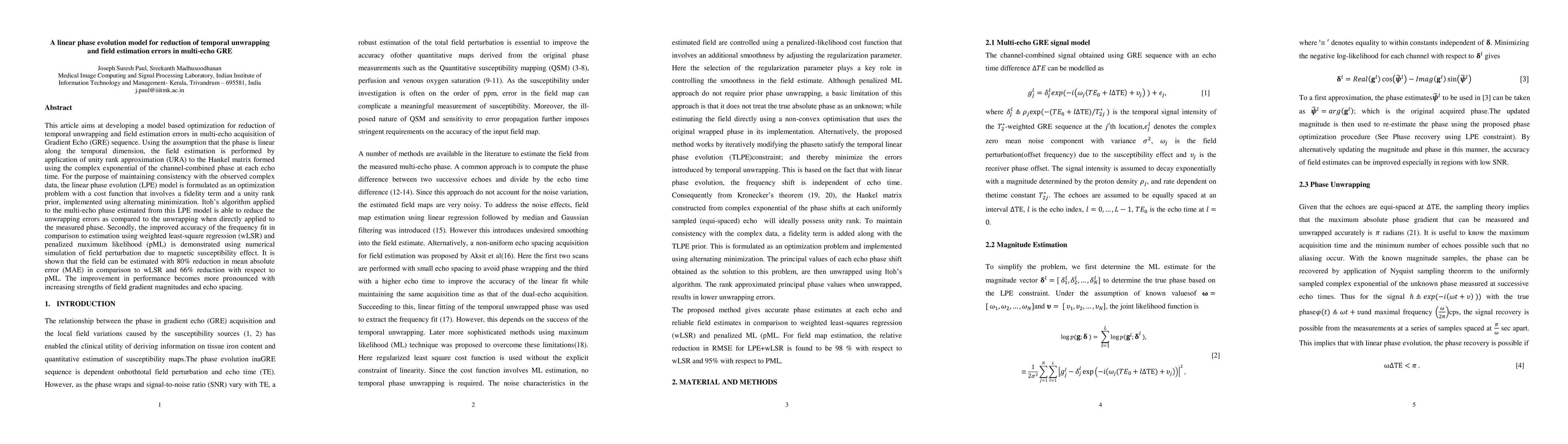 This paper proposes a linear phase evolution model to minimize temporal unwrapping and field estimation errors in multi-echo Gradient Echo sequences. The model uses a unity rank approximation for field estimation and demonstrates significant reductions in mean absolute error compared to traditional methods, especially under strong field gradients.