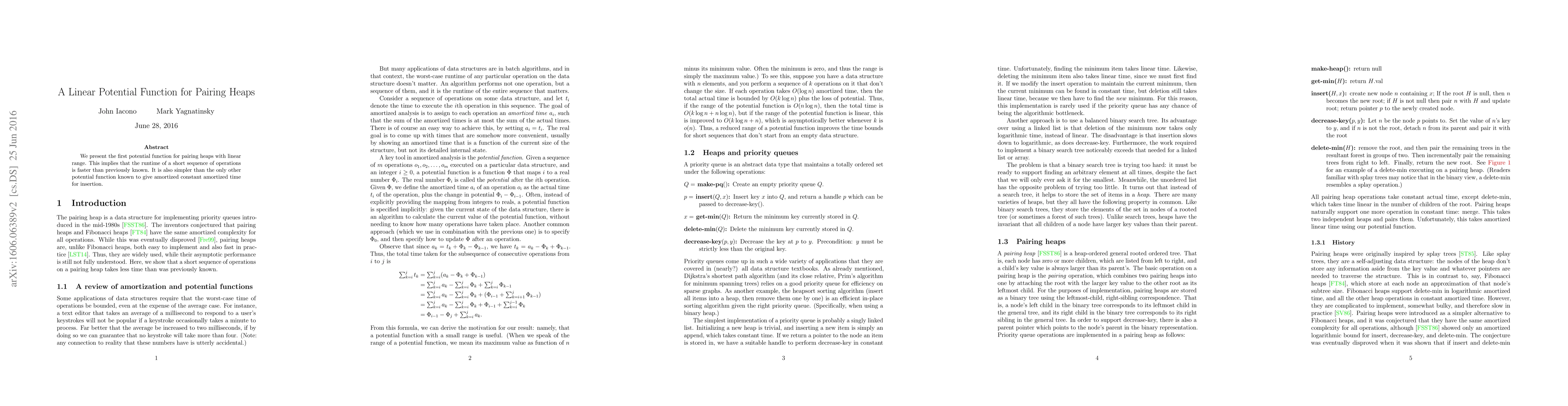 Summary: This paper introduces a novel linear potential function for pairing heaps, demonstrating faster amortized runtime for sequences of operations compared to previous methods, and offering a simpler approach than existing potential functions.