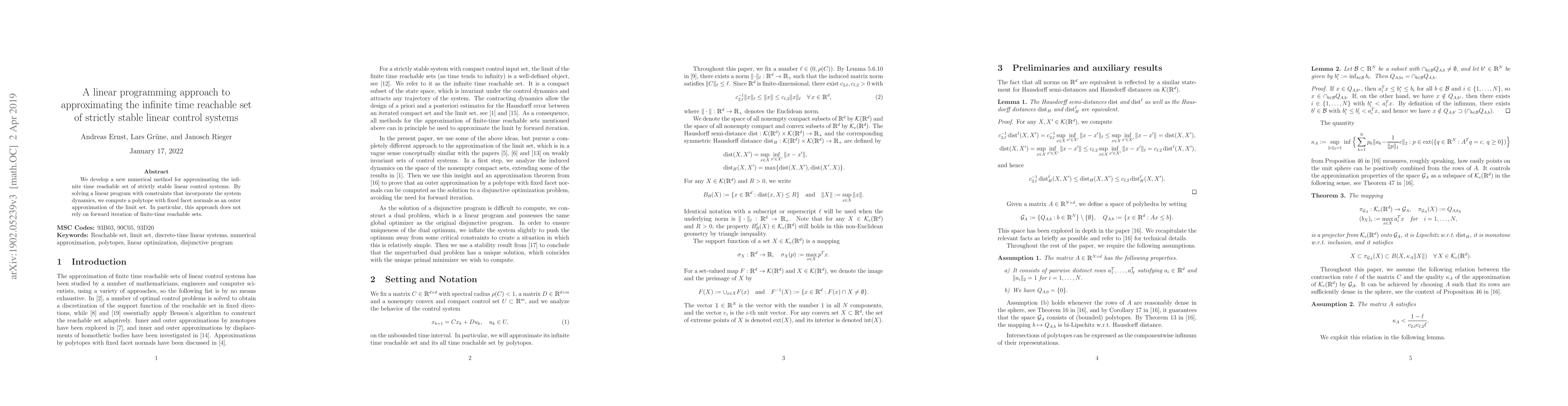 This paper introduces a linear programming method to approximate the infinite time reachable set of strictly stable linear control systems, constructing a polytope with fixed facet normals as an outer approximation without relying on the forward iteration of finite-time reachable sets.