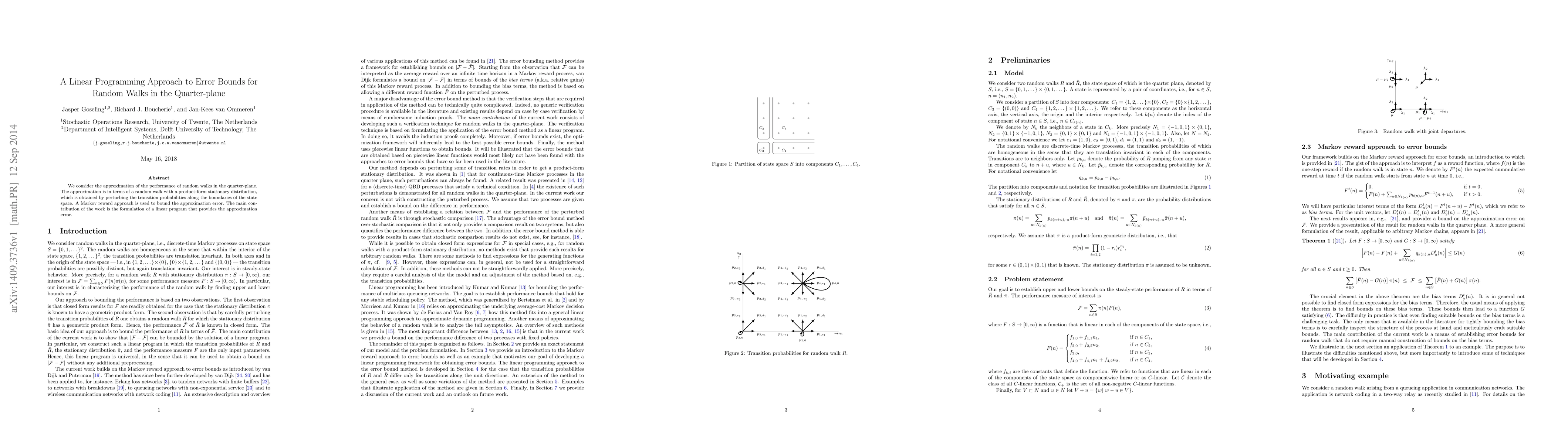 We consider the approximation of the performance of random walks in the quarter-plane. The approximation is in terms of a random walk with a product-form stationary distribution, which is obtained by perturbing the transition probabilities along the boundaries of the state space. A Markov reward approach is used to bound the approximation error. The main contribution of the work is the formulation of a linear program that provides the approximation error.