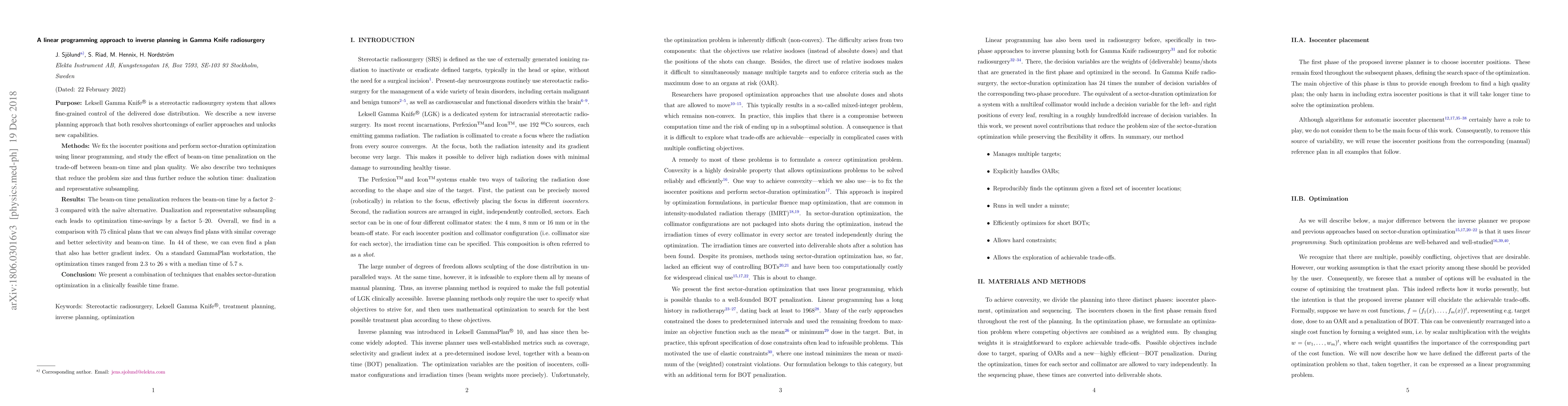 This paper introduces a linear programming method for inverse planning in Gamma Knife radiosurgery, optimizing sector-duration and reducing beam-on time by 2-3x. Techniques like dualization and subsampling further cut solution times by 5-20x, achieving comparable or superior plan quality in 75 clinical comparisons.