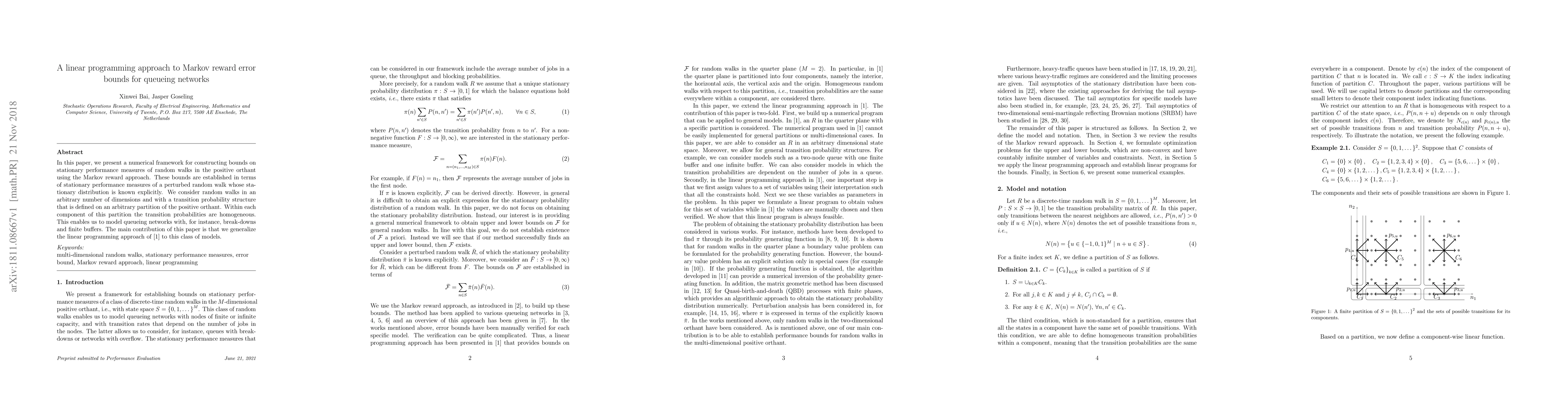 This paper develops a linear programming framework for establishing Markov reward error bounds on stationary performance measures of random walks in queueing networks. It generalizes a previous approach to handle models with breakdowns and finite buffers, leveraging a known stationary distribution of a perturbed random walk.