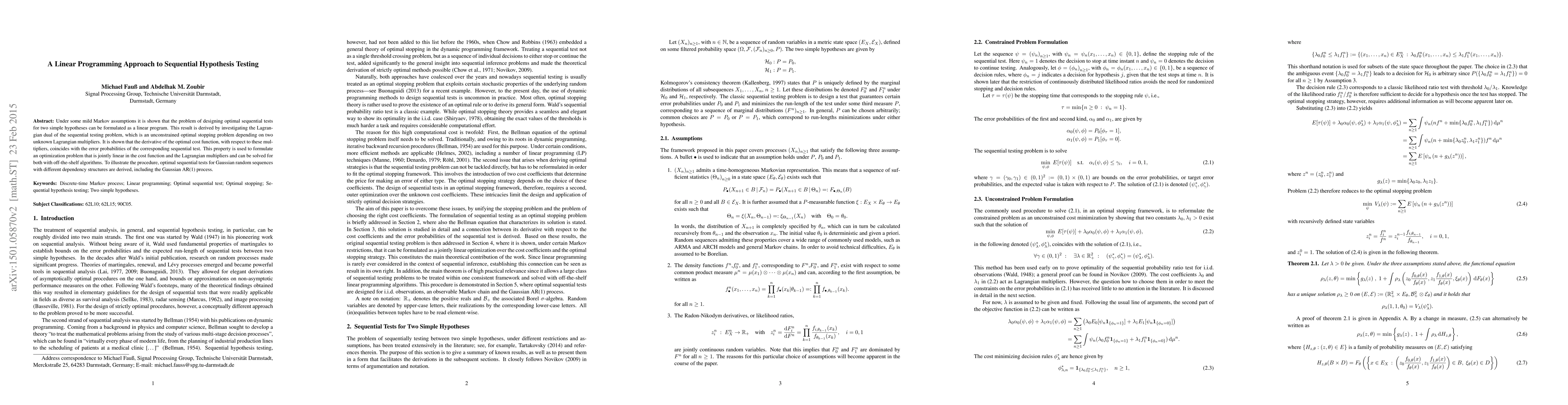 This paper presents a linear programming approach to design optimal sequential tests for two simple hypotheses under Markov assumptions. The method leverages the Lagrangian dual of the sequential testing problem to derive a linear program that can be solved using standard algorithms, demonstrating its application through Gaussian random sequences.