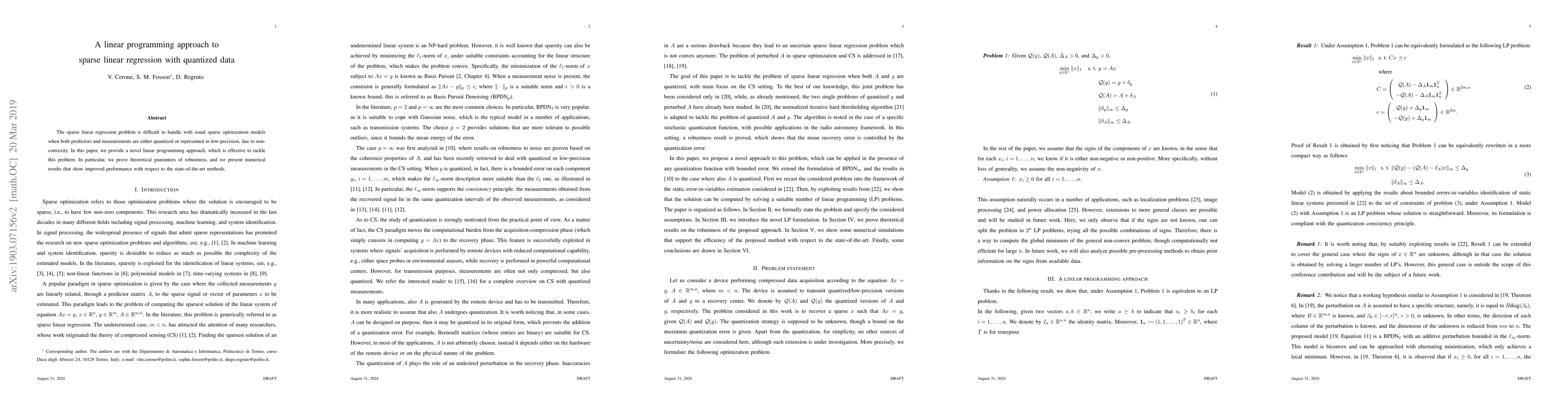 The sparse linear regression problem is difficult to handle with usual sparse optimization models when both predictors and measurements are either quantized or represented in low-precision, due to non-convexity. In this paper, we provide a novel linear programming approach, which is effective to tackle this problem. In particular, we prove theoretical guarantees of robustness, and we present numerical results that show improved performance with respect to the state-of-the-art methods.